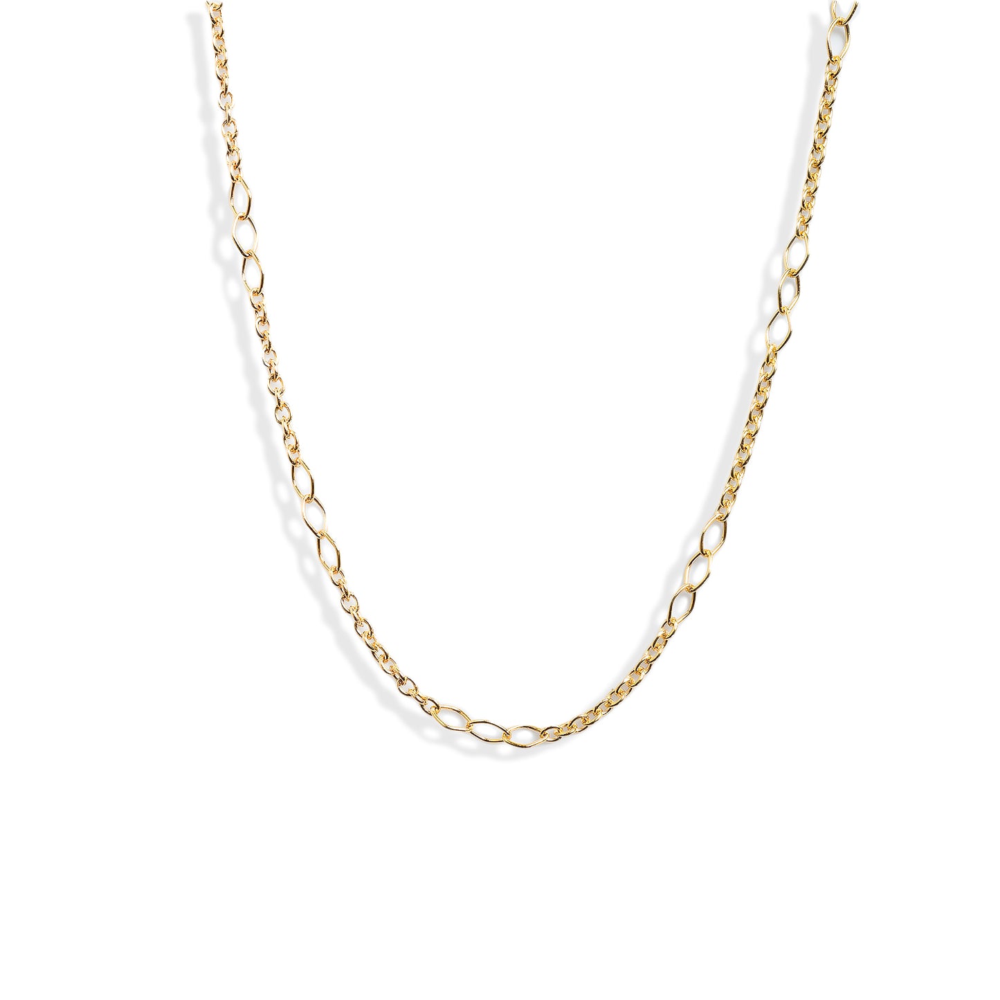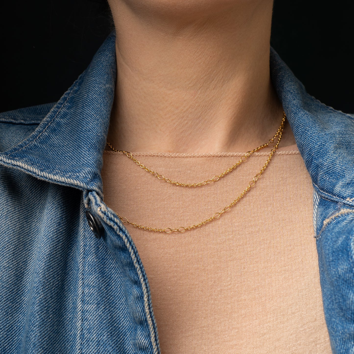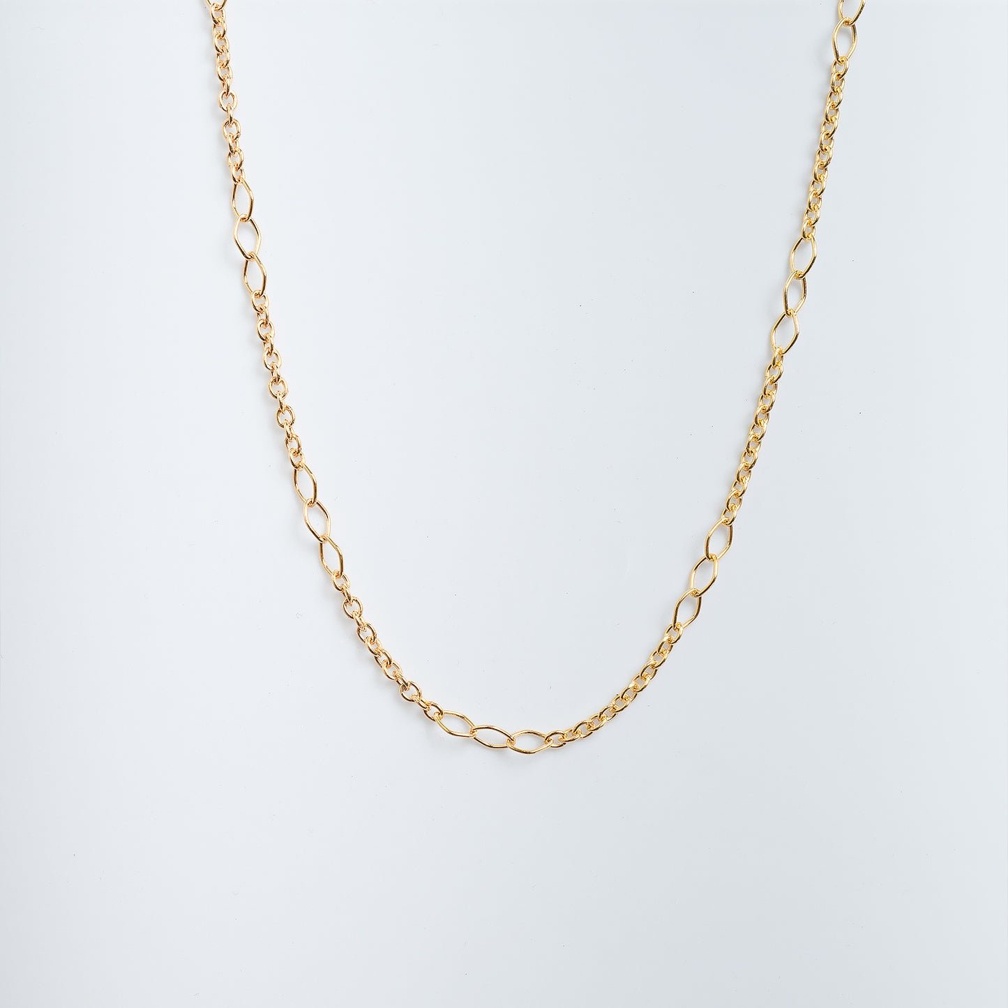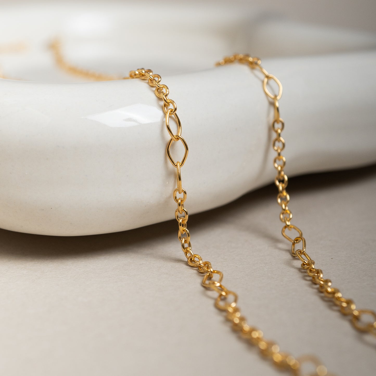 The Balance Chain is a modern 14k gold-filled necklace designed with an artful rhythm of three larger links followed by smaller delicate links, creating the perfect blend of strength and softness. This adjustable gold chain necklace is 18 inches long, but can be clasped at different points to wear at 16 inches or shorter, giving you multiple styling options in one piece. Durable, hypoallergenic, and safe for sensitive skin, this versatile layering necklace offers everyday elegance with subtle body and presence—effortless, refined, and endlessly wearable.