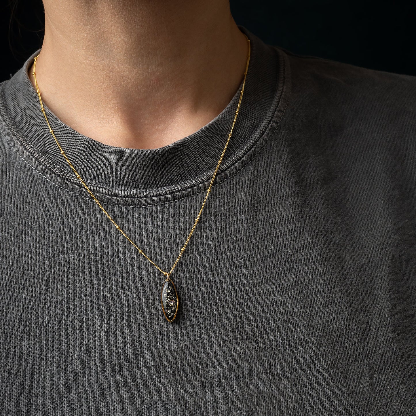 These necklaces features glass-like crystal with crushed Pyrite stone, Swarovski crystals and pigments inside.