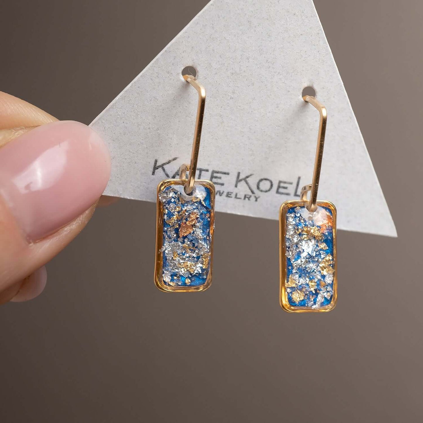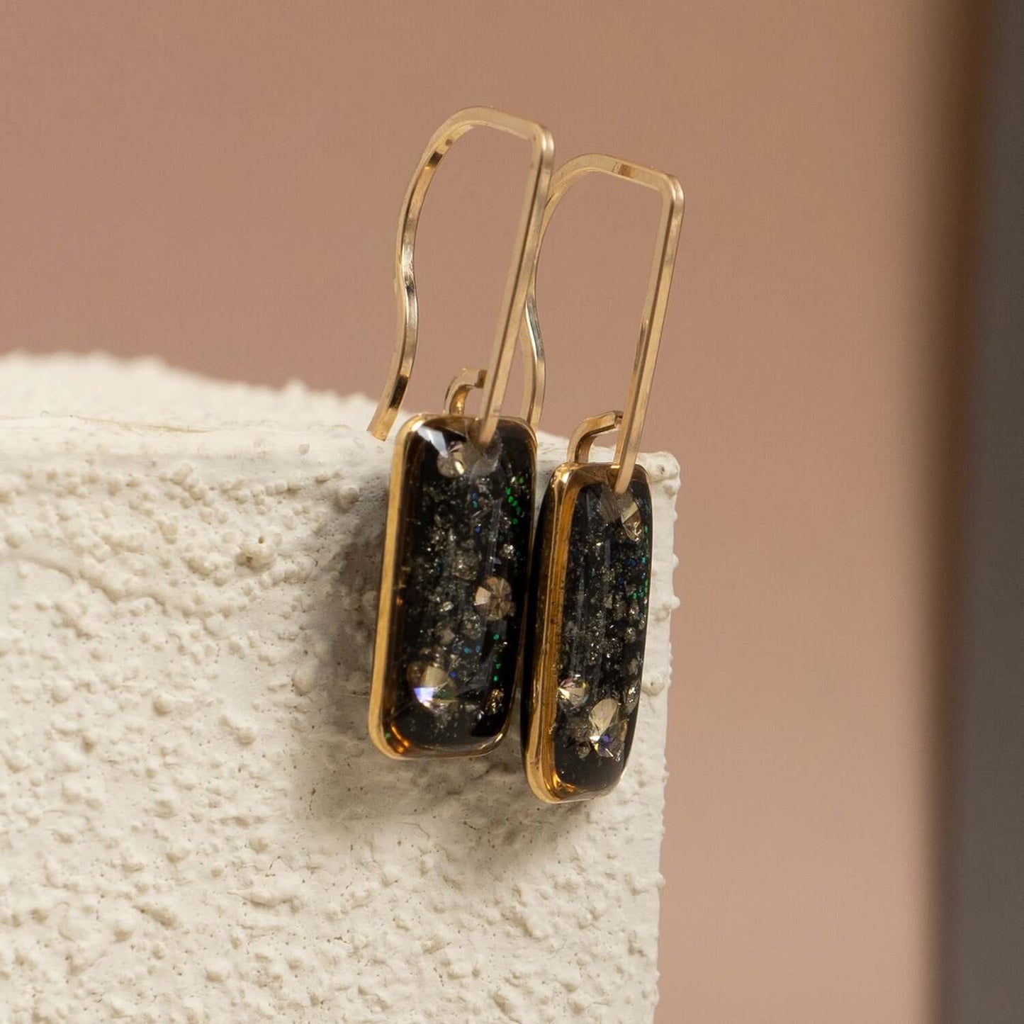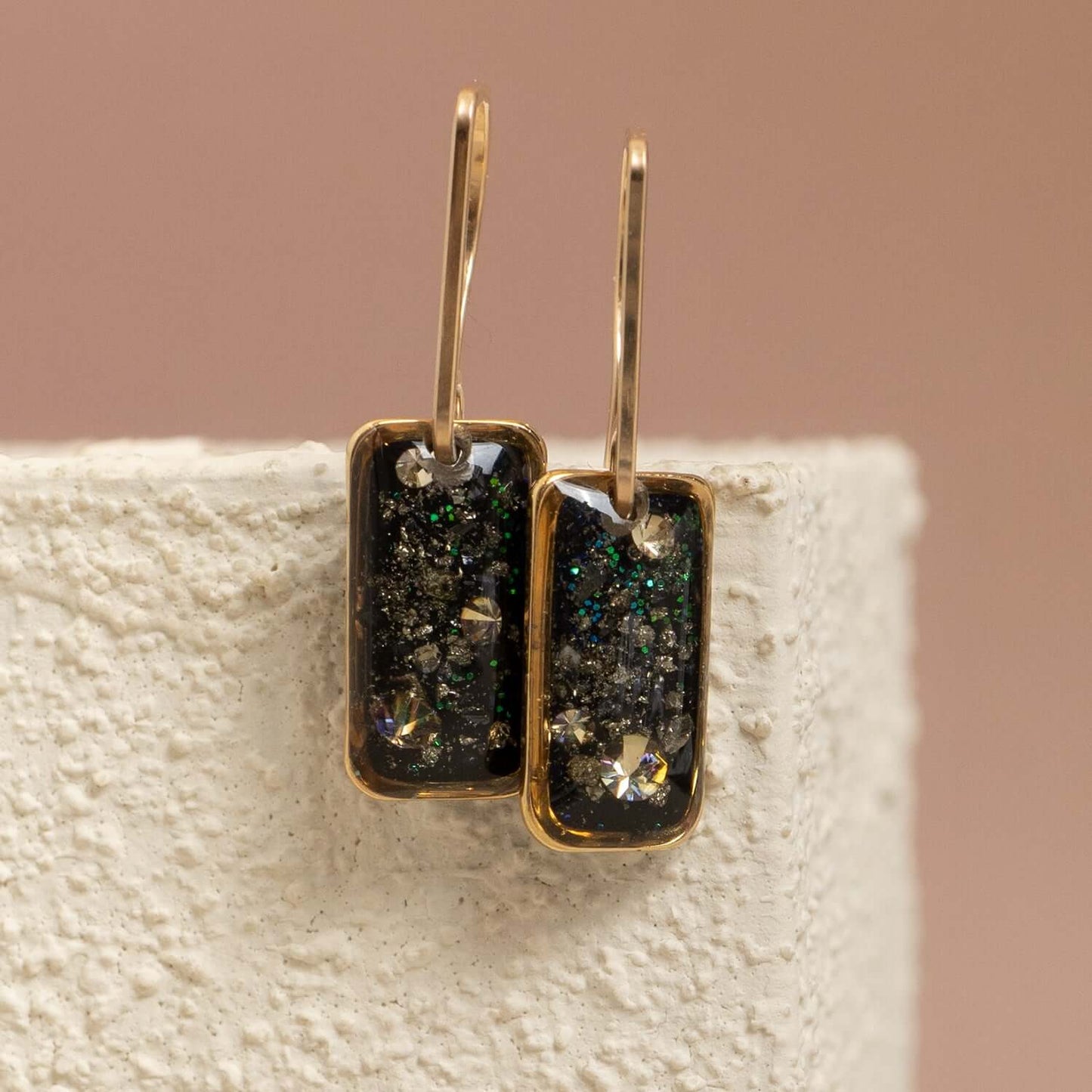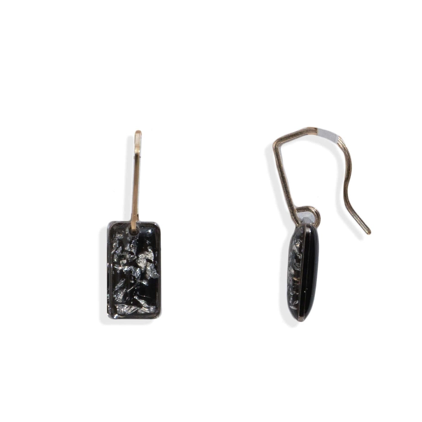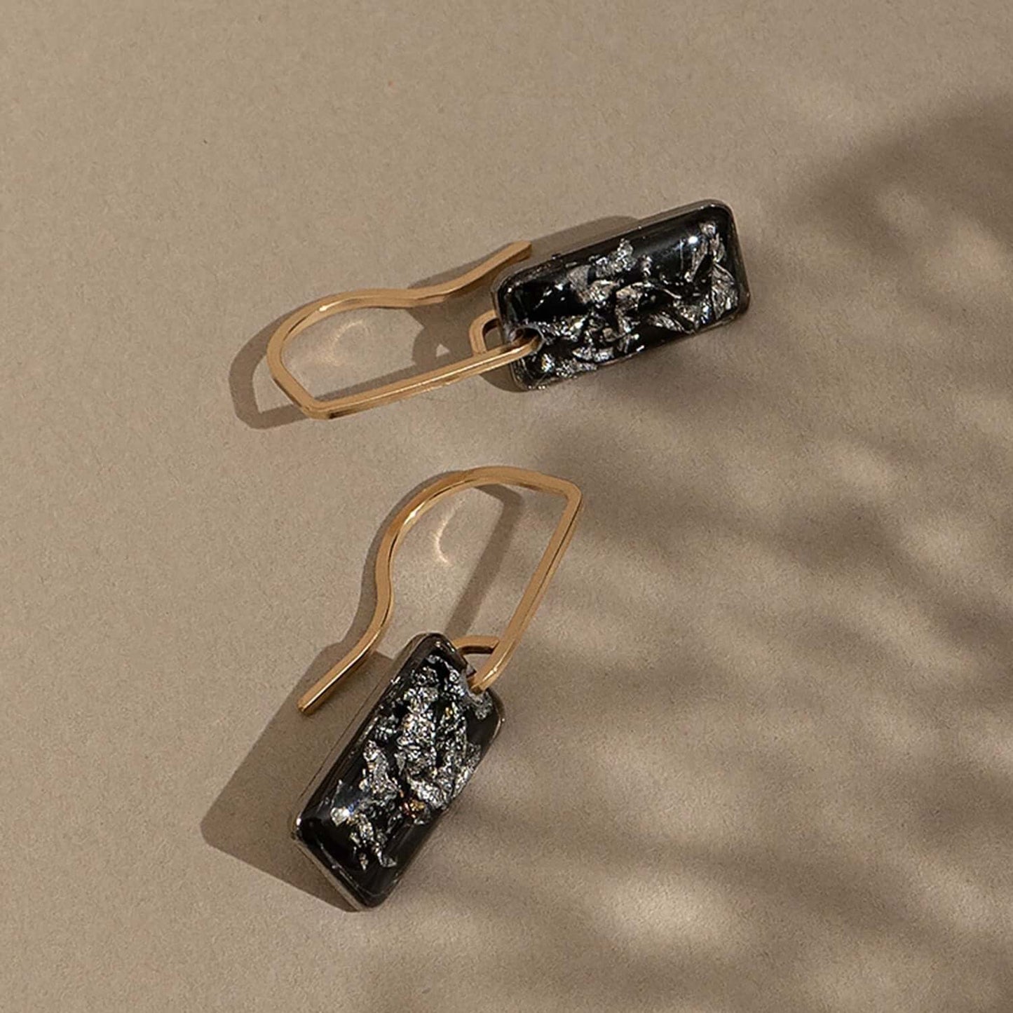 We gave our beloved June Earrings a bold little update—an elongated rectangle crystal suspended from a sleek, minimalist bar hook in 14k gold-filled (hello, sensitive-ear friendly!). Inside the crystal, a floating layer of silver foil shimmers against an inky black backdrop—think midnight with a metallic twist.