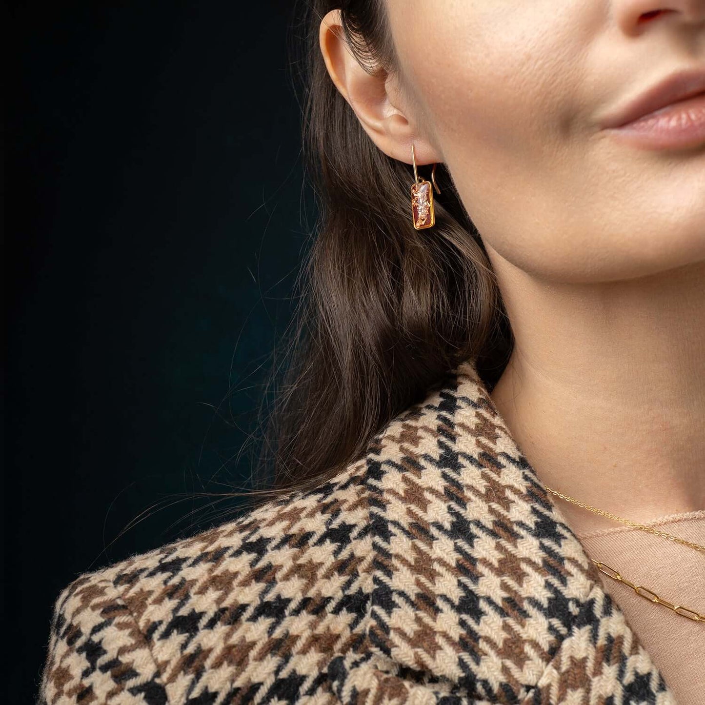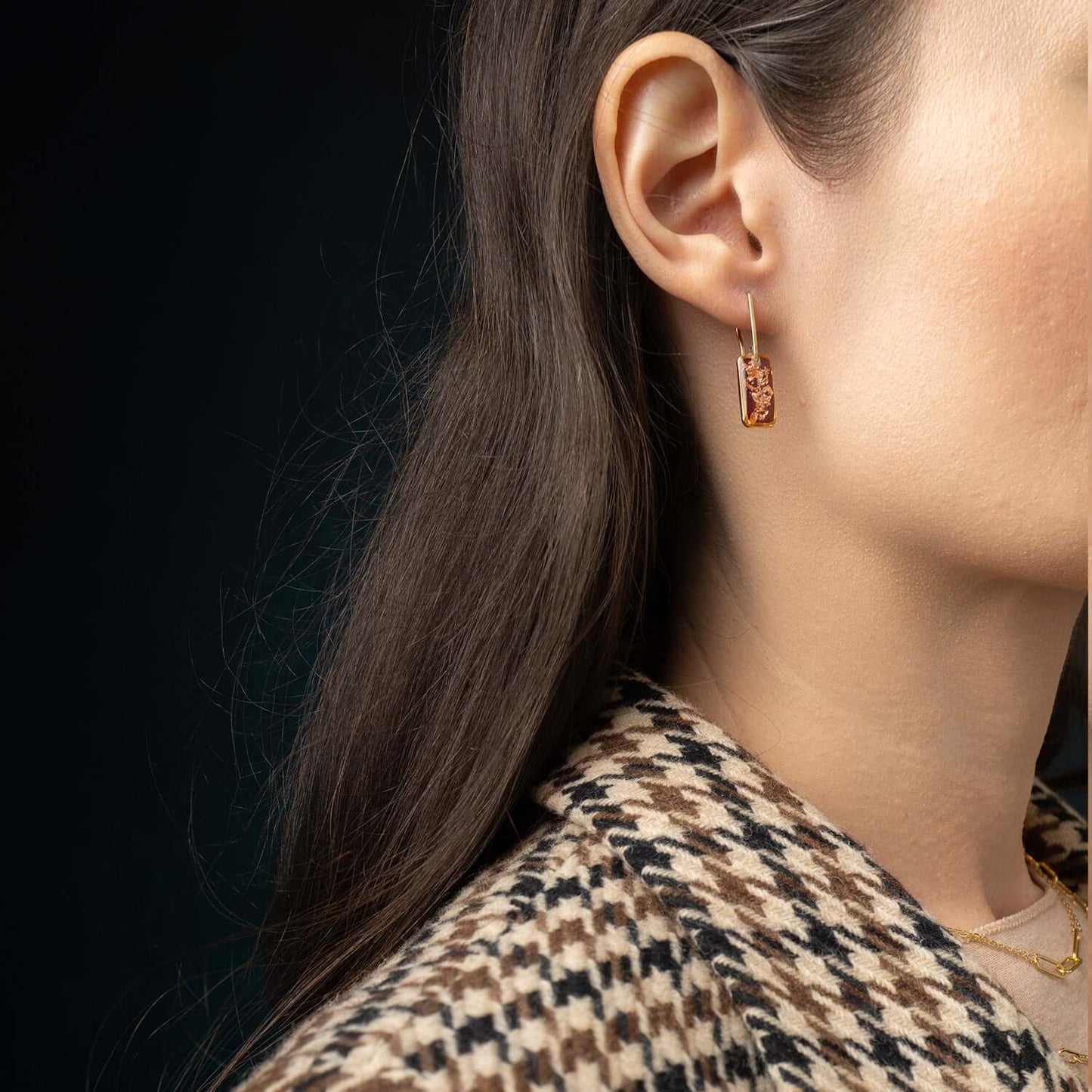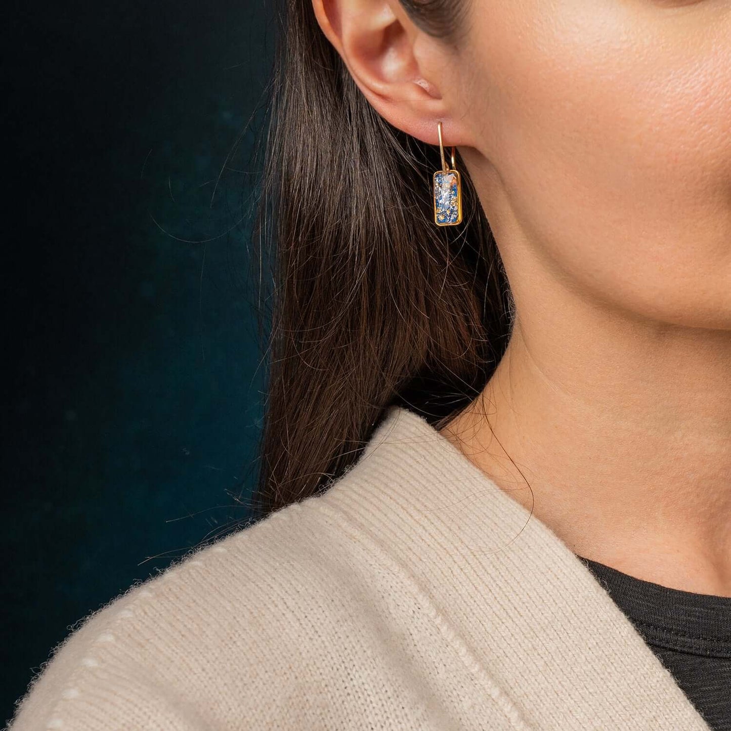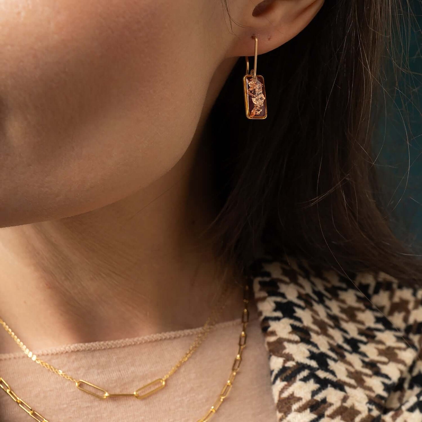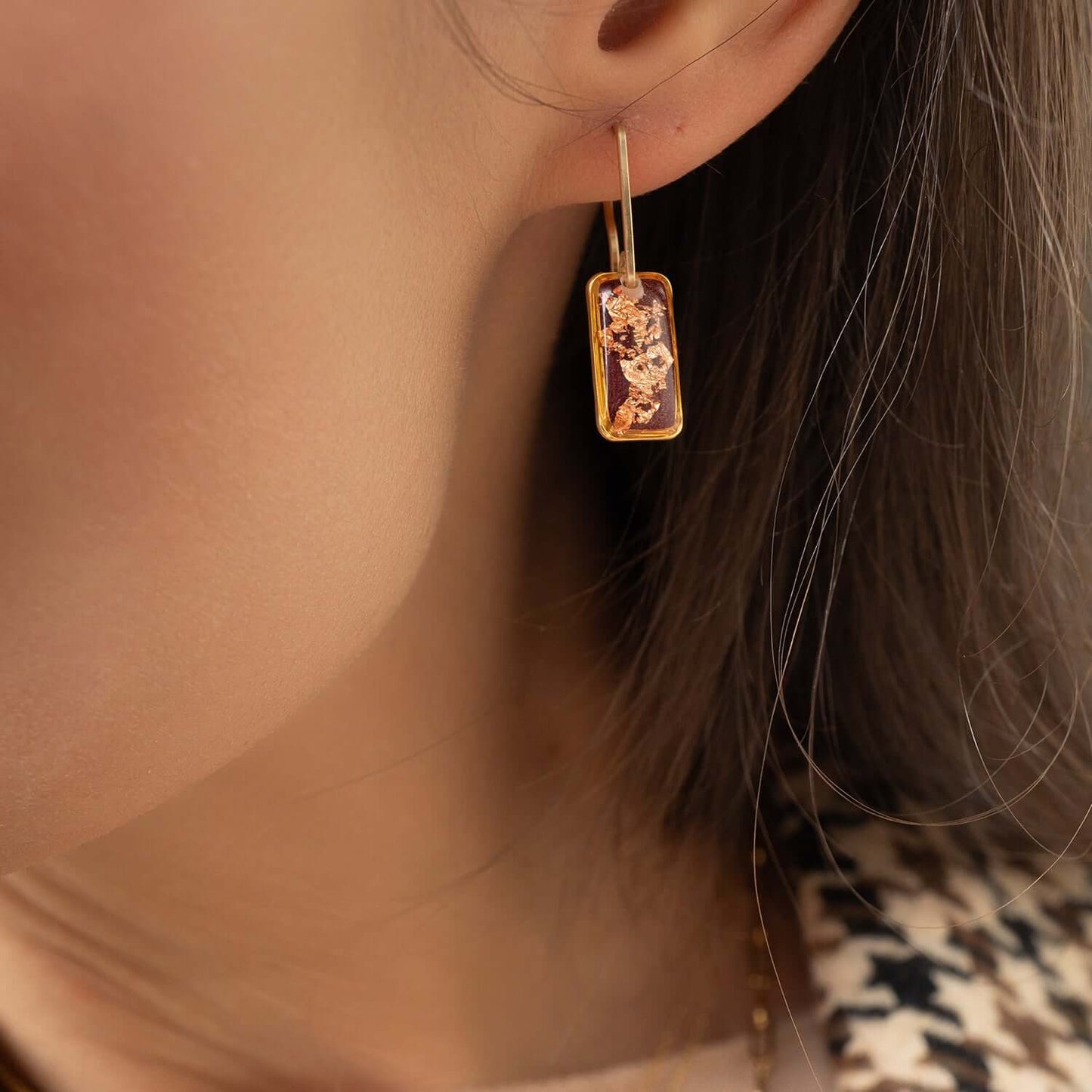 A striking balance of edgy and elegant, made to elevate your work wardrobe but cool enough to carry into cocktail hour. Lightweight and comfy for all-day wear. Gold-filled hook (safe for sensitive ears). A modern essential with a moody shimmer.