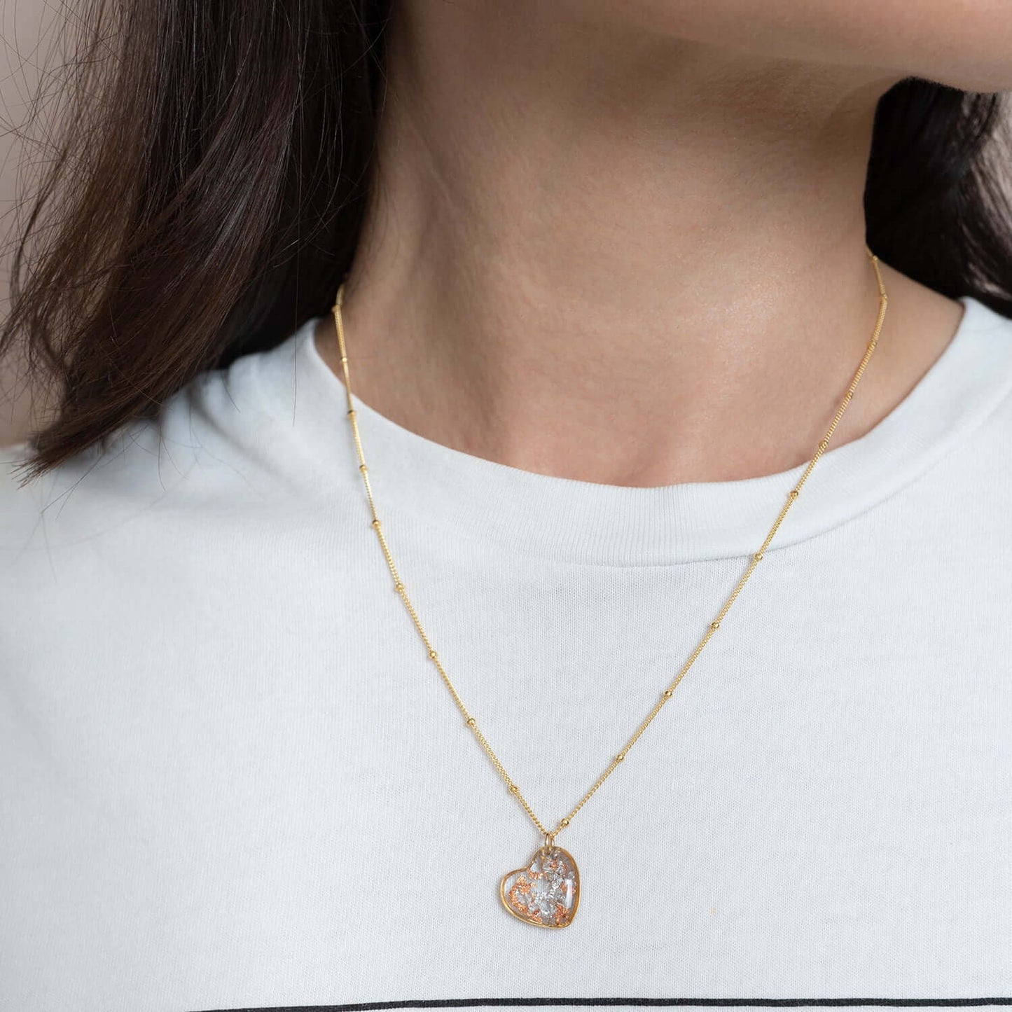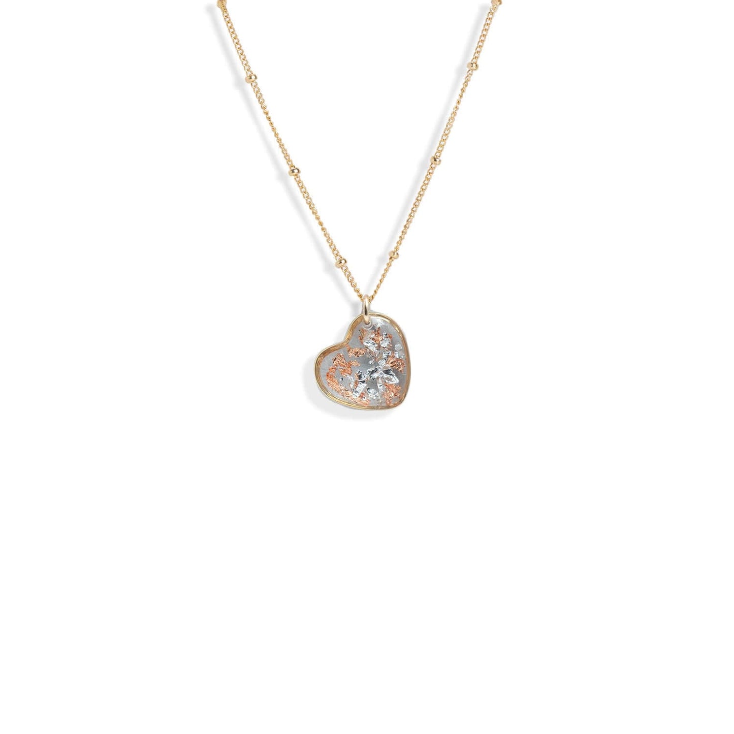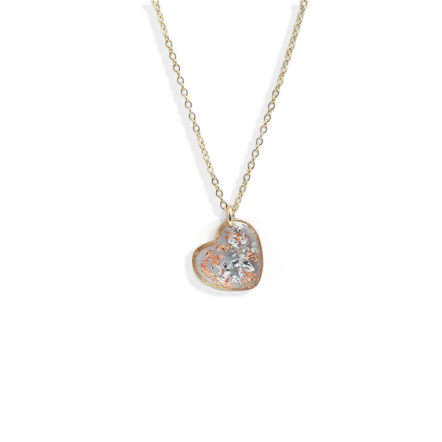 Shimmer Heart Necklace feature glass-like crystal capturing mixed metal foils. Every piece is hand made in our studio. Safe for sensitive skin.