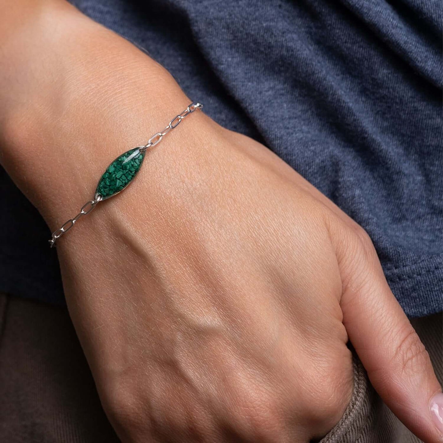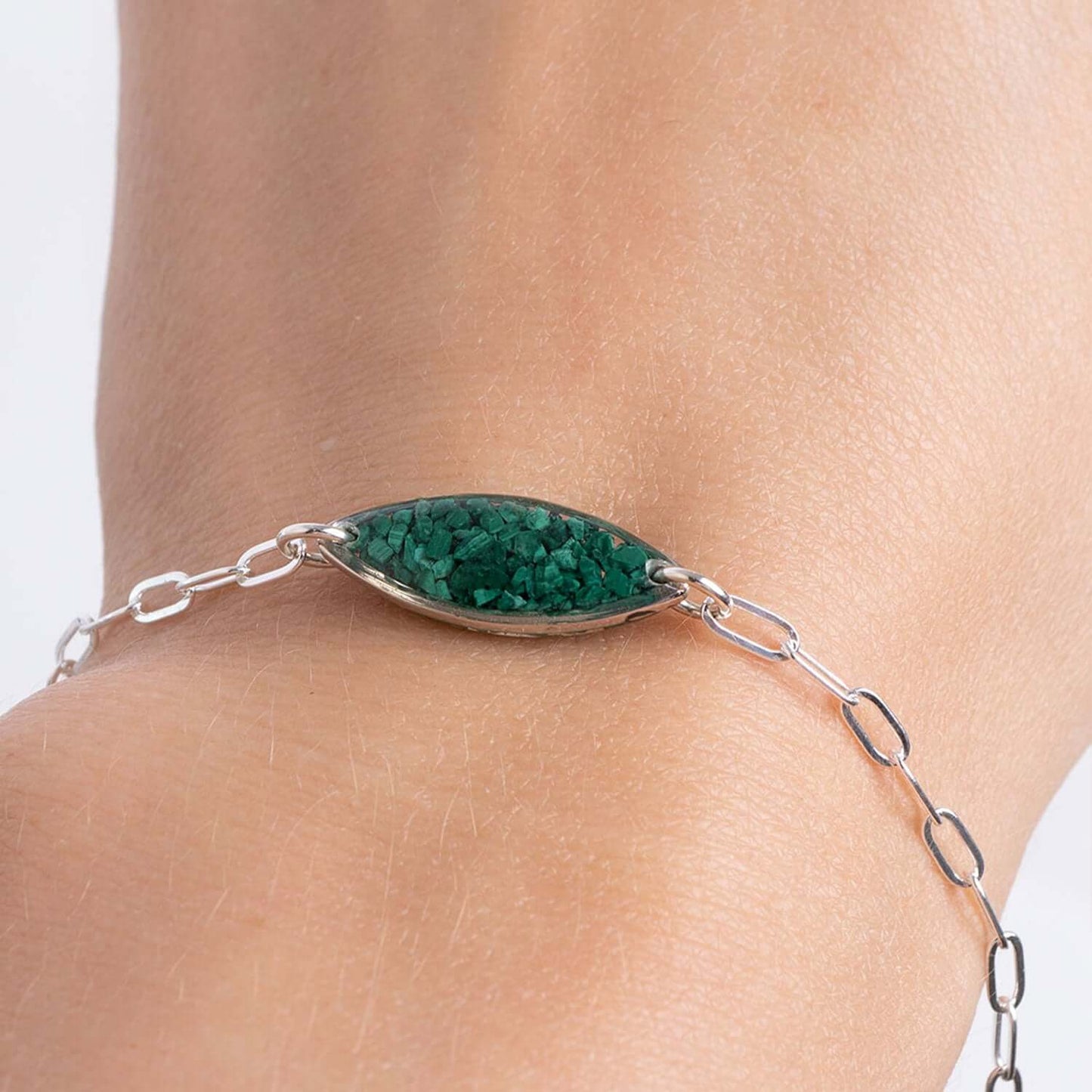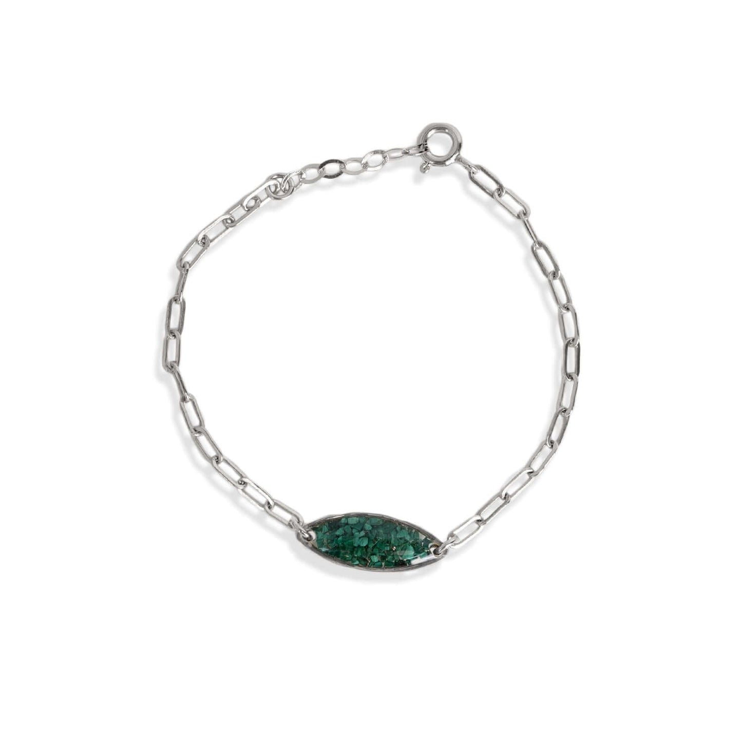Beautiful Deep green hues of Malachite stones Bracelet is a eye catcher. Every crystal is hand crafted and as one of a kind as every person. Crystal features glass-like resin with crushed Malachite stones inside.