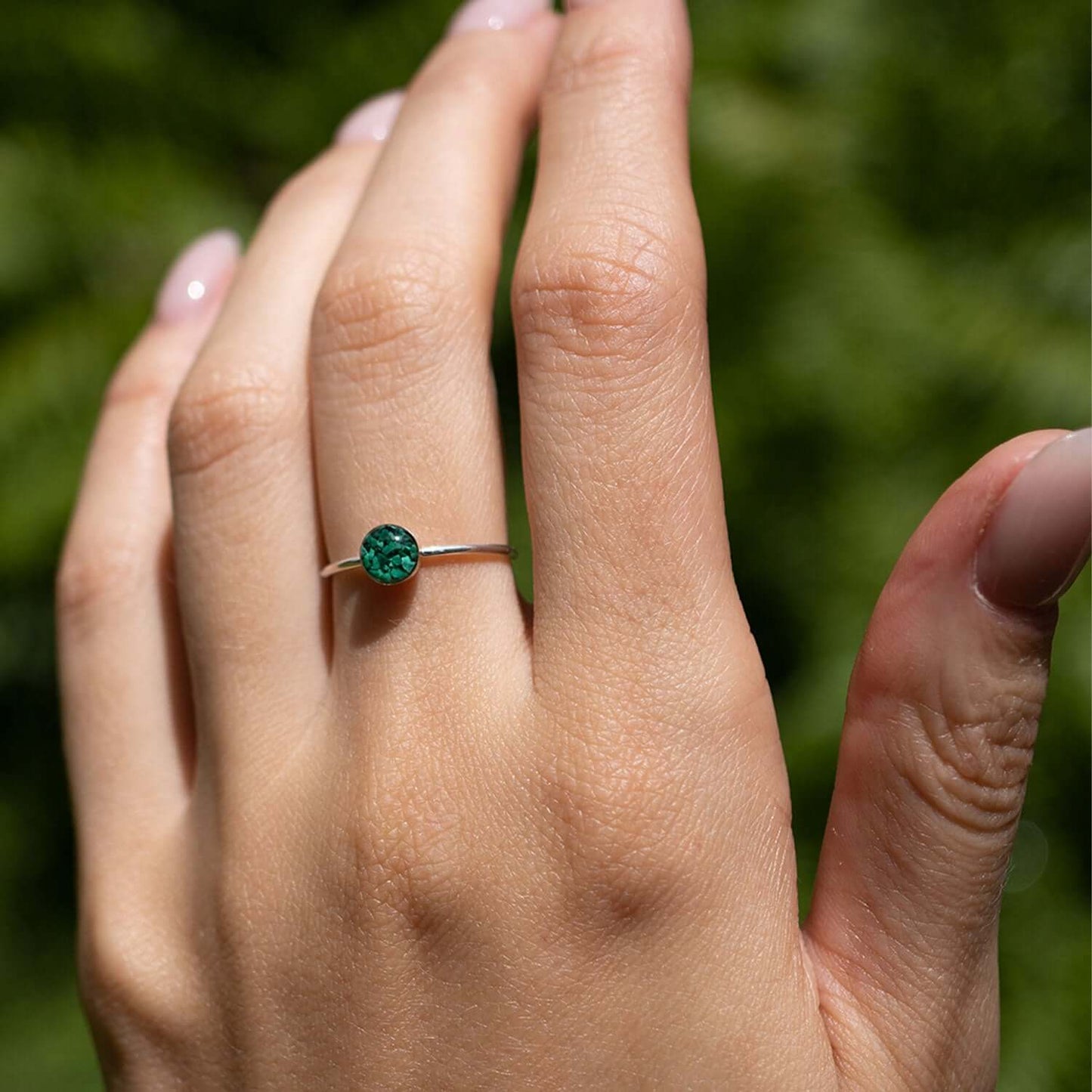 Delicate green ring with tiny Malachite stone pieces captured in glass like resin in a 5mm round shape. Bright natural green ring is a perfect compliment to your everyday style. Beautiful by itself or in a stack. Every piece is hand made in our studio and always unique.