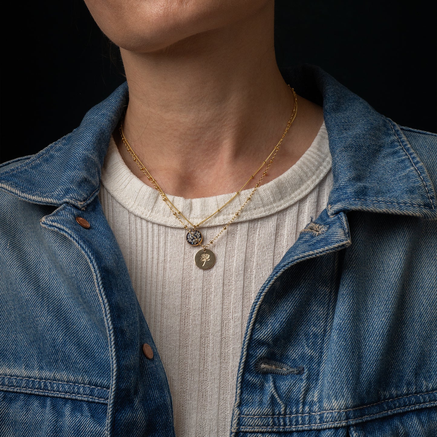 The Violet Floral Round Necklace captures the elegance of preserved blooms in a dreamy violet hue. This 10 mm round pendant features real pressed flowers suspended in a deep blue-purple background with a subtle shimmer from Mother of Pearl. Hung on a 17-inch 14k gold-filled beaded chain, it’s delicate, and safe for sensitive skin. A perfect romantic necklace, ideal for weddings, gifting, or everyday wear with a touch of nature’s beauty.