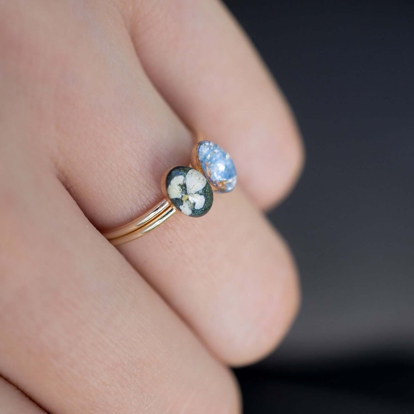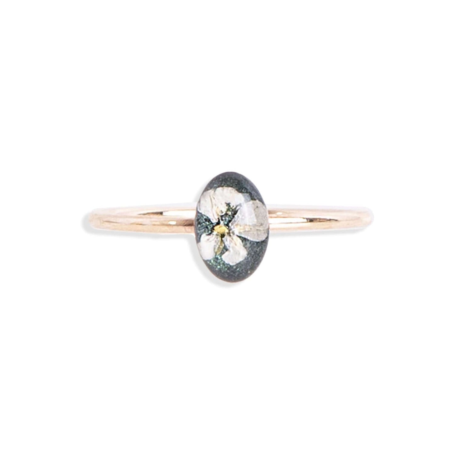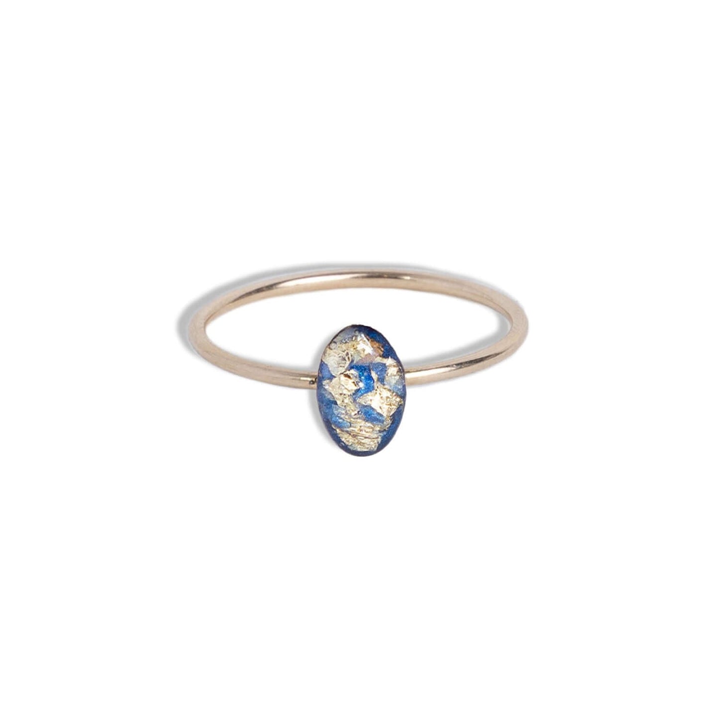 Tiny adorable oval ring with tiny crushed stone pieces, Swarovski crystals, real flowers, shimmering metal foils and pigments captured in glass like resin in three crystal sizes.