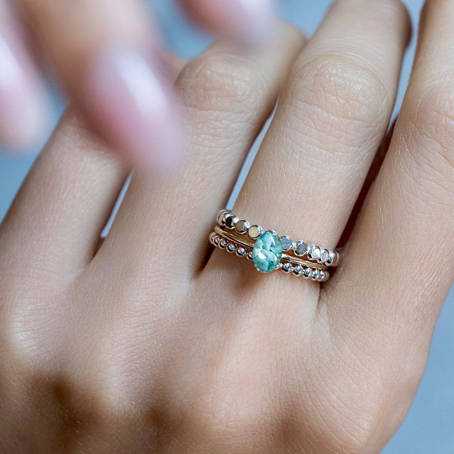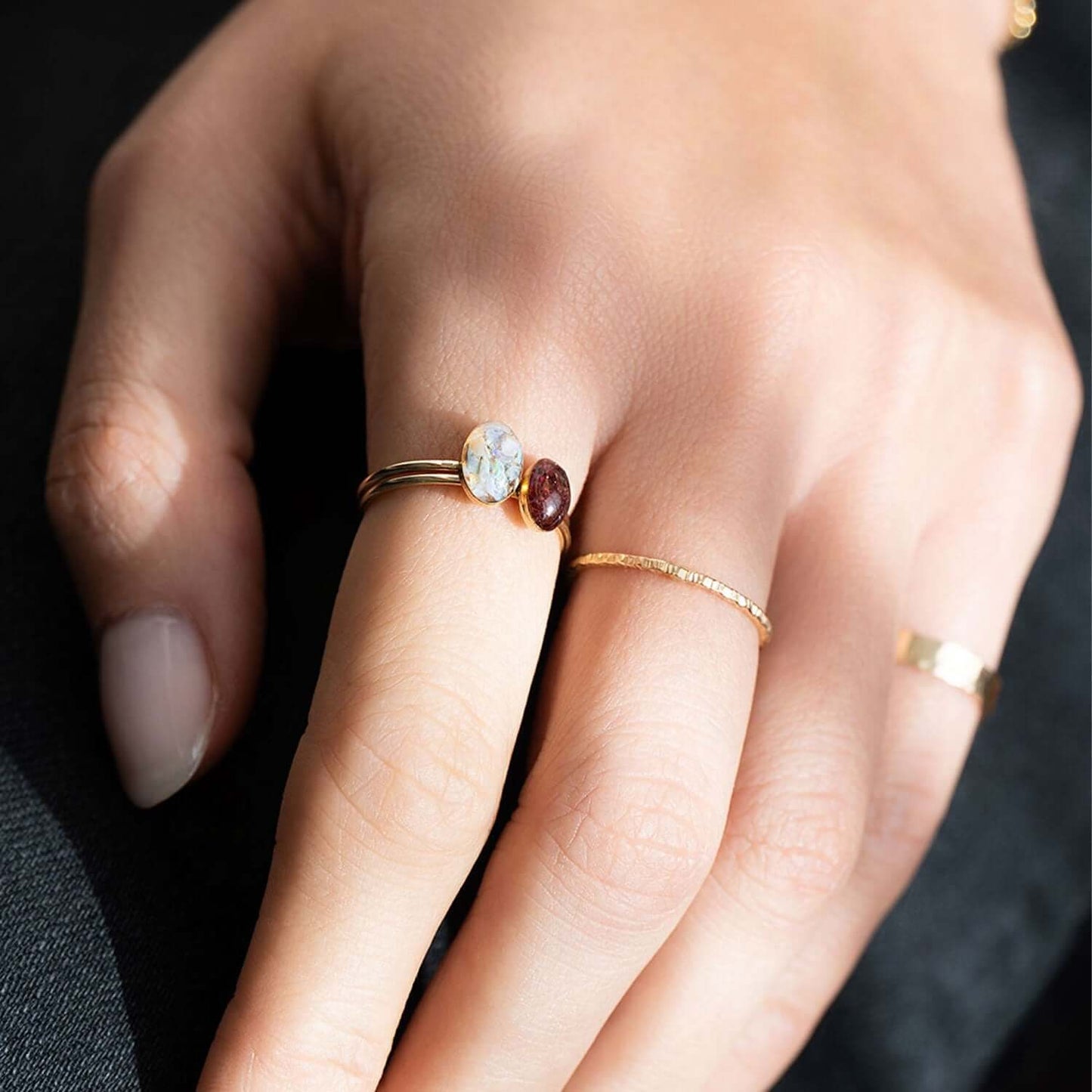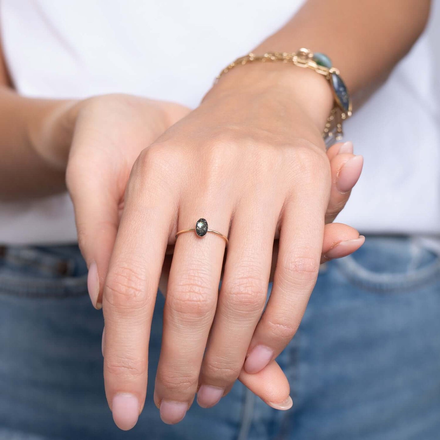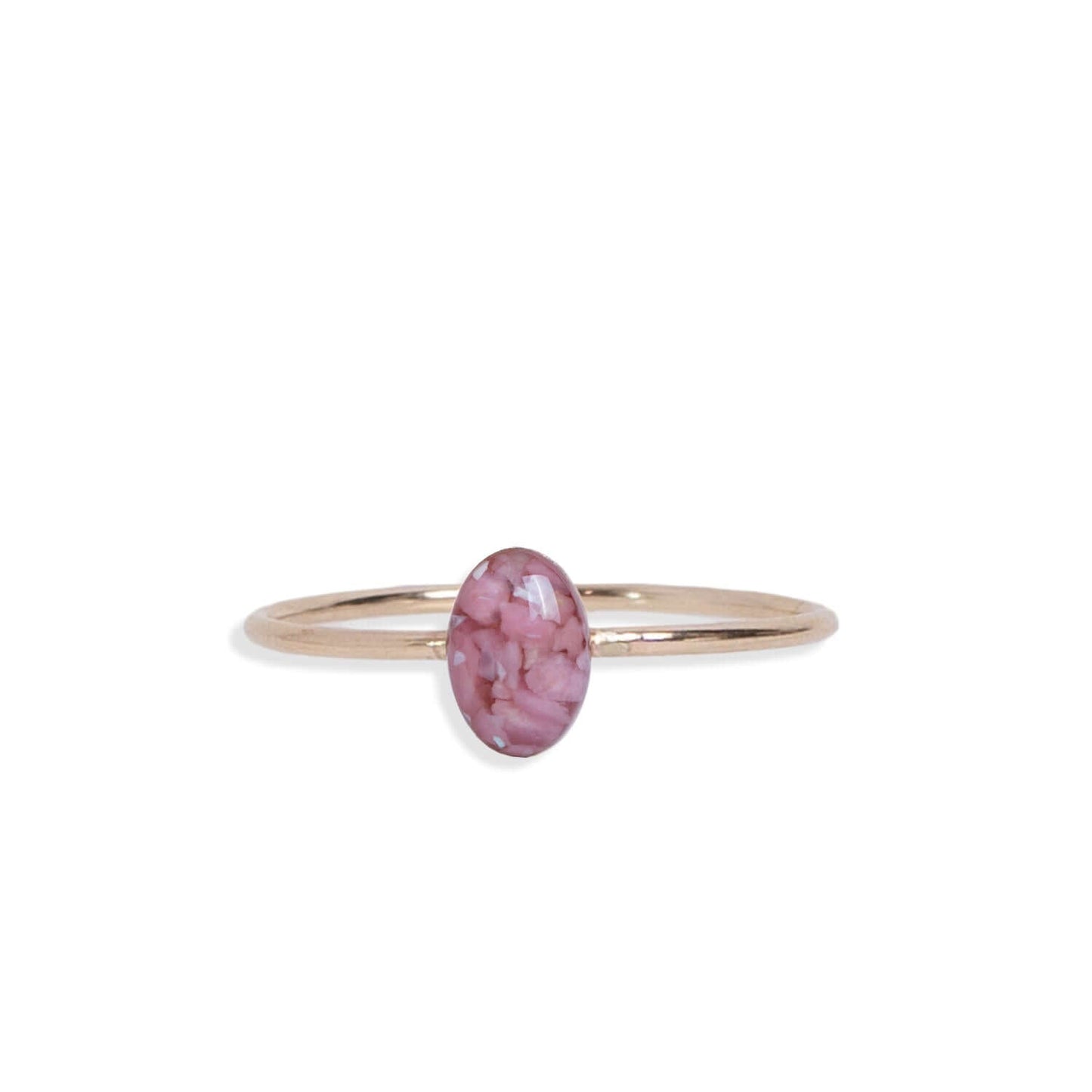 Tiny adorable oval ring with tiny crushed stone pieces, Swarovski crystals, real flowers, shimmering metal foils and pigments captured in glass like resin in three crystal sizes.