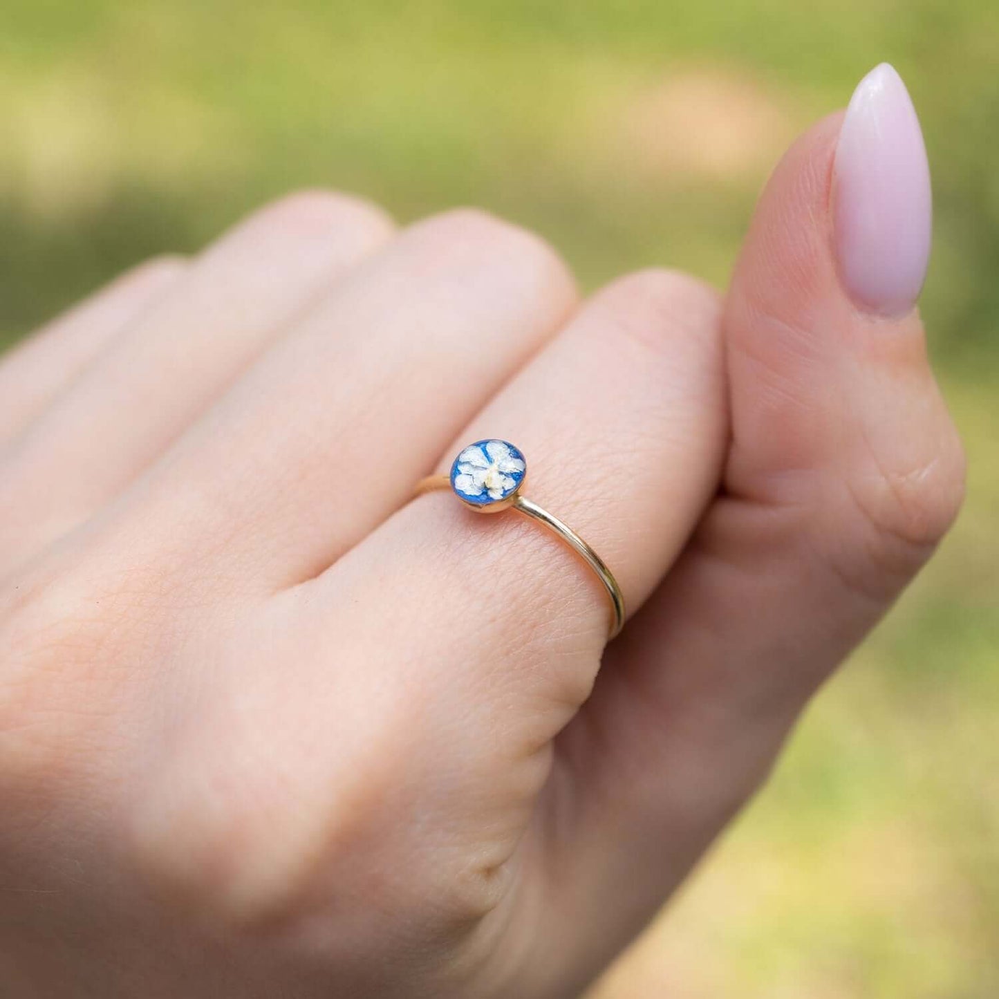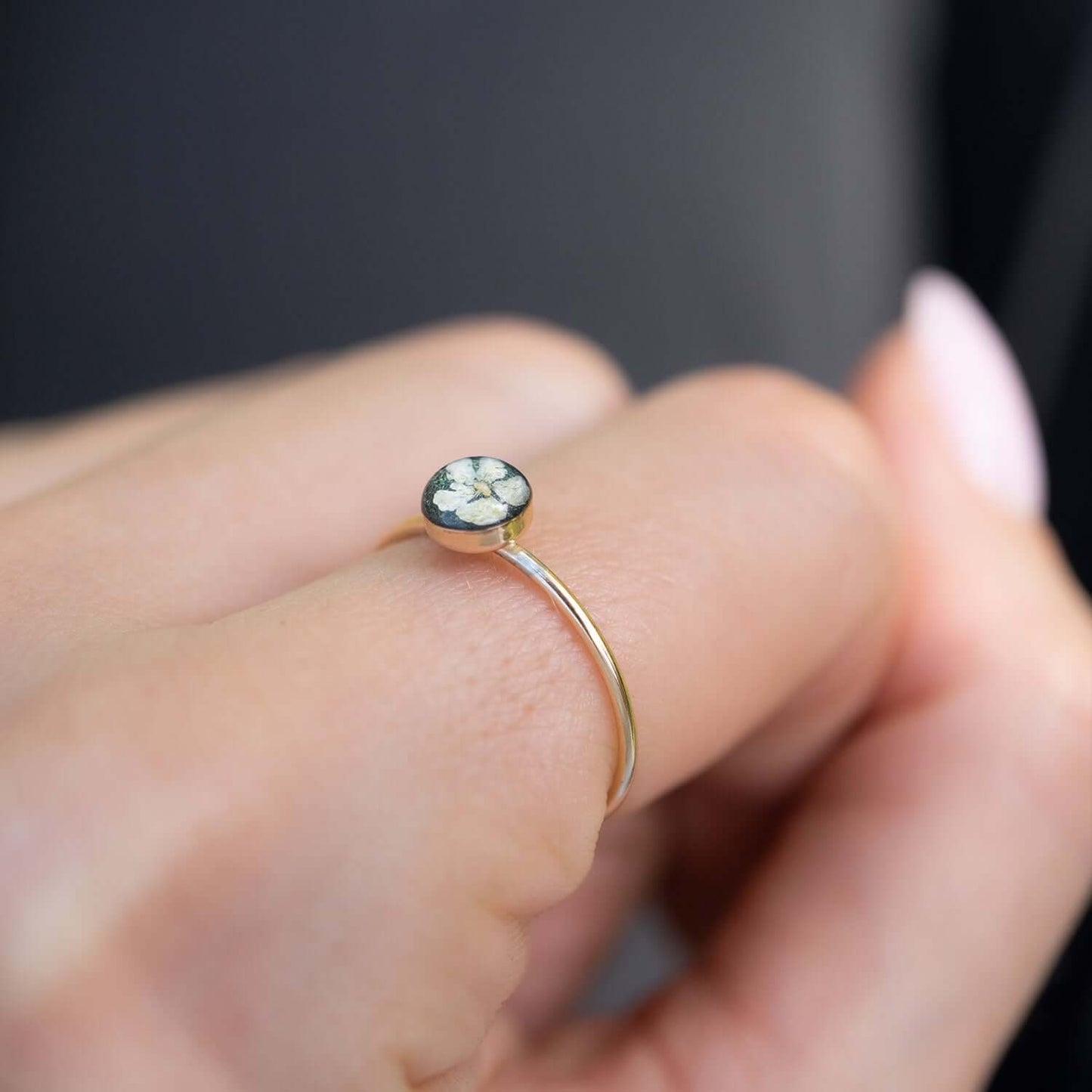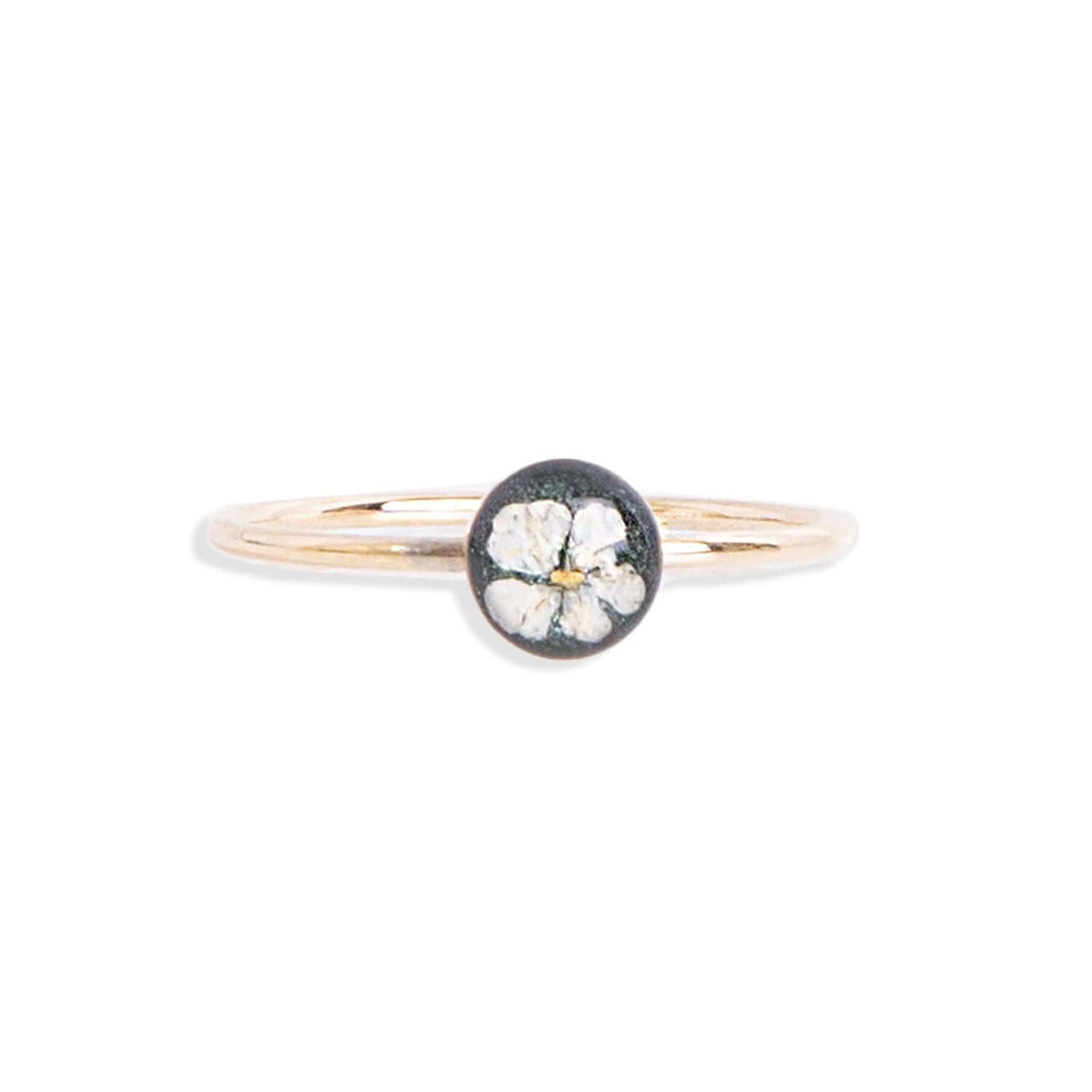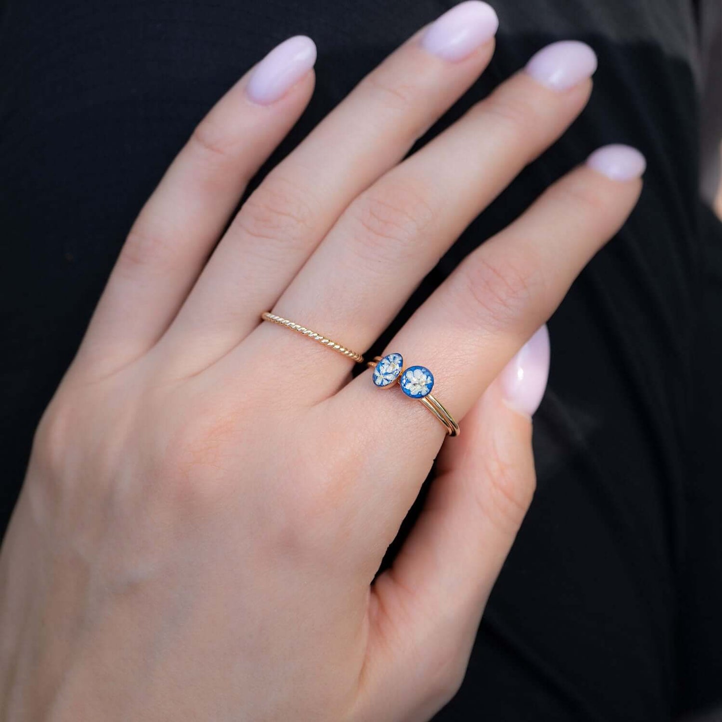 The whole assortment of our bestselling dainty tiny round crystal rings, featuring crushed stones, Swarovski crystals, real flowers, and a mixture of metal foils sealed under the glass-like resin.