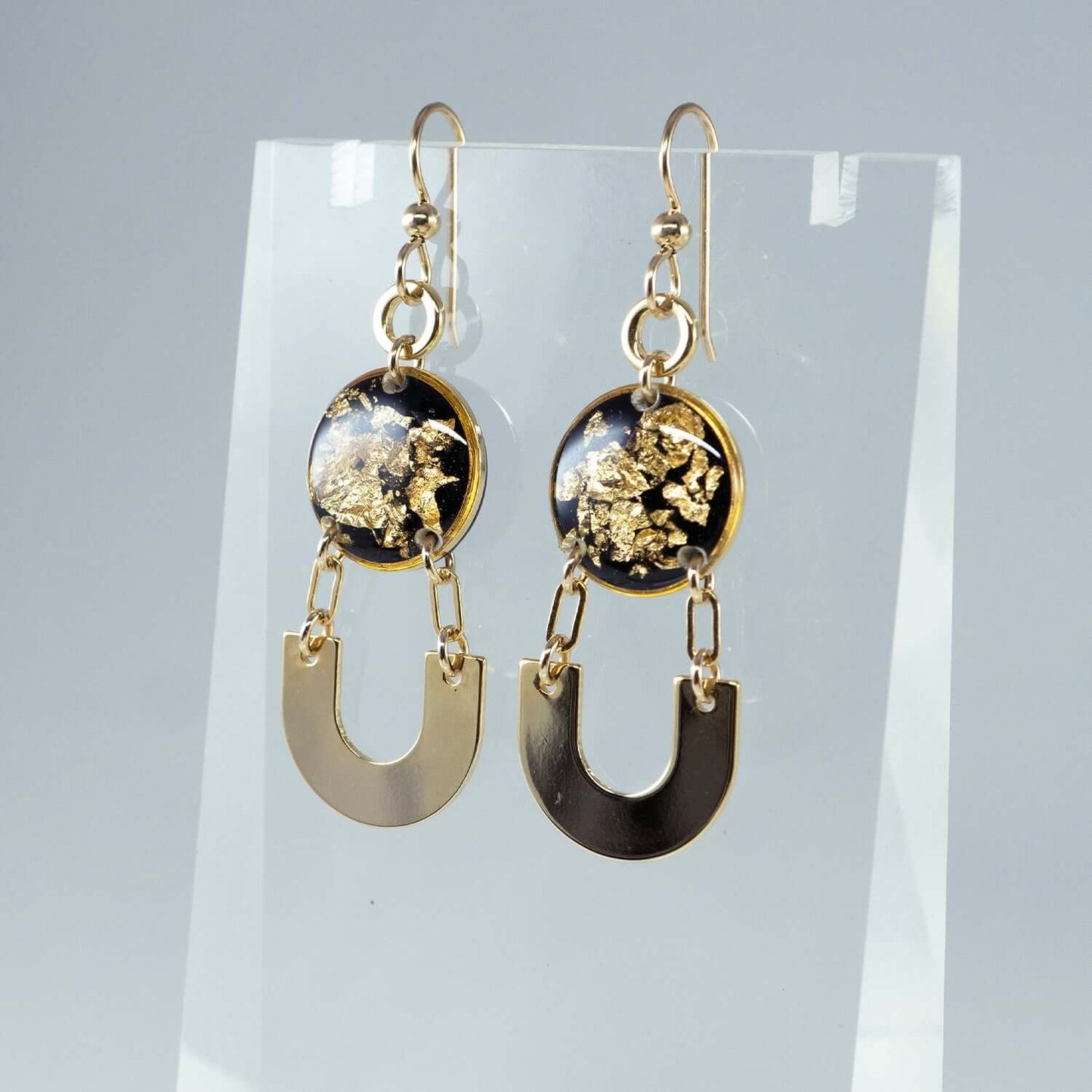 Dangling Black and Gold Earrings are edgy eye catcher with am inspiration in modern Gatsby style. Every crystal is hand crafted and as one of a kind as every person. Crystal features glass-like resin with Gold foils on a black background.