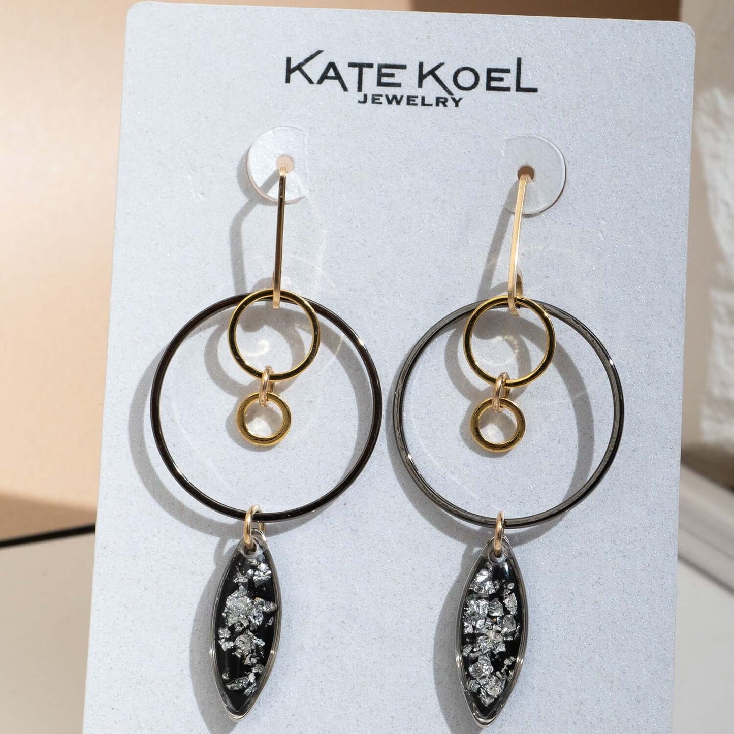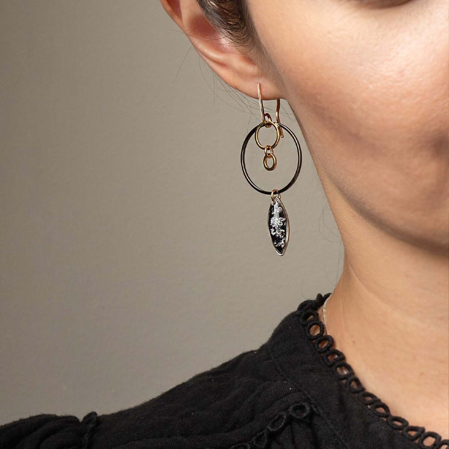 Lightweight statement earrings with an abundance of shimmer and mystery. Silver foils contrasts beautifully against a black background. The perfect mixed metal color option, making it easy to style wether you are a wedding guest this season, planning a holiday party outfit or simply want to add something special for an everyday outfit.