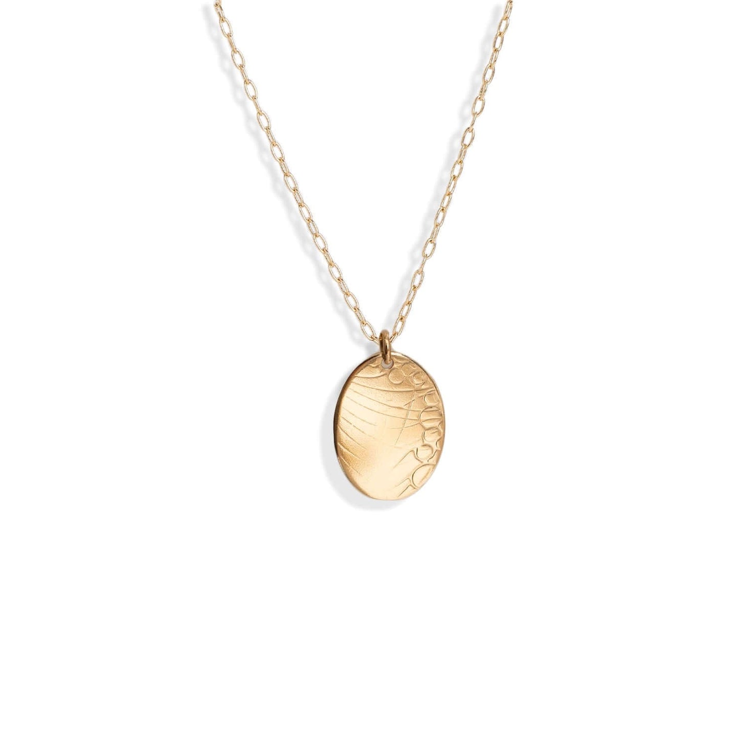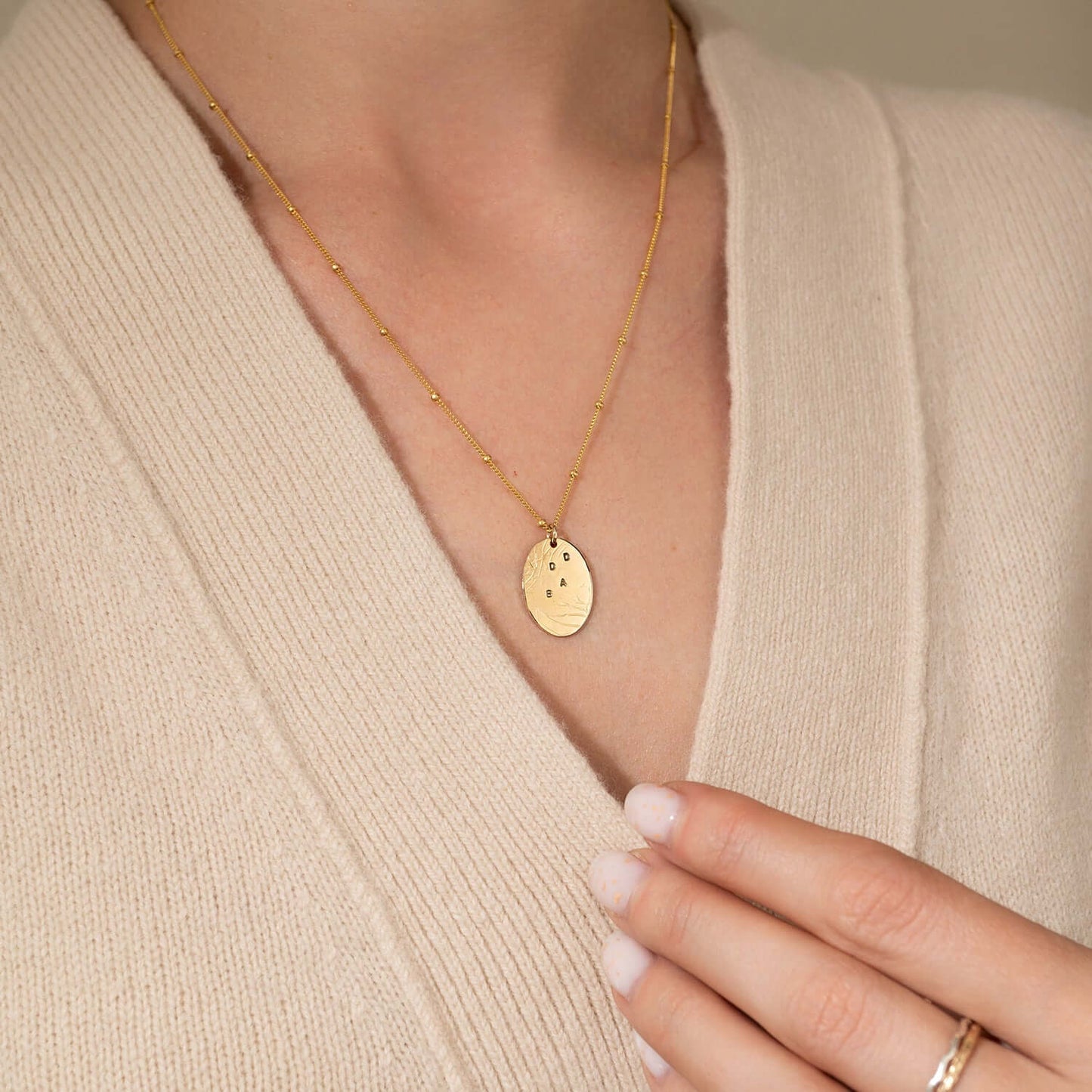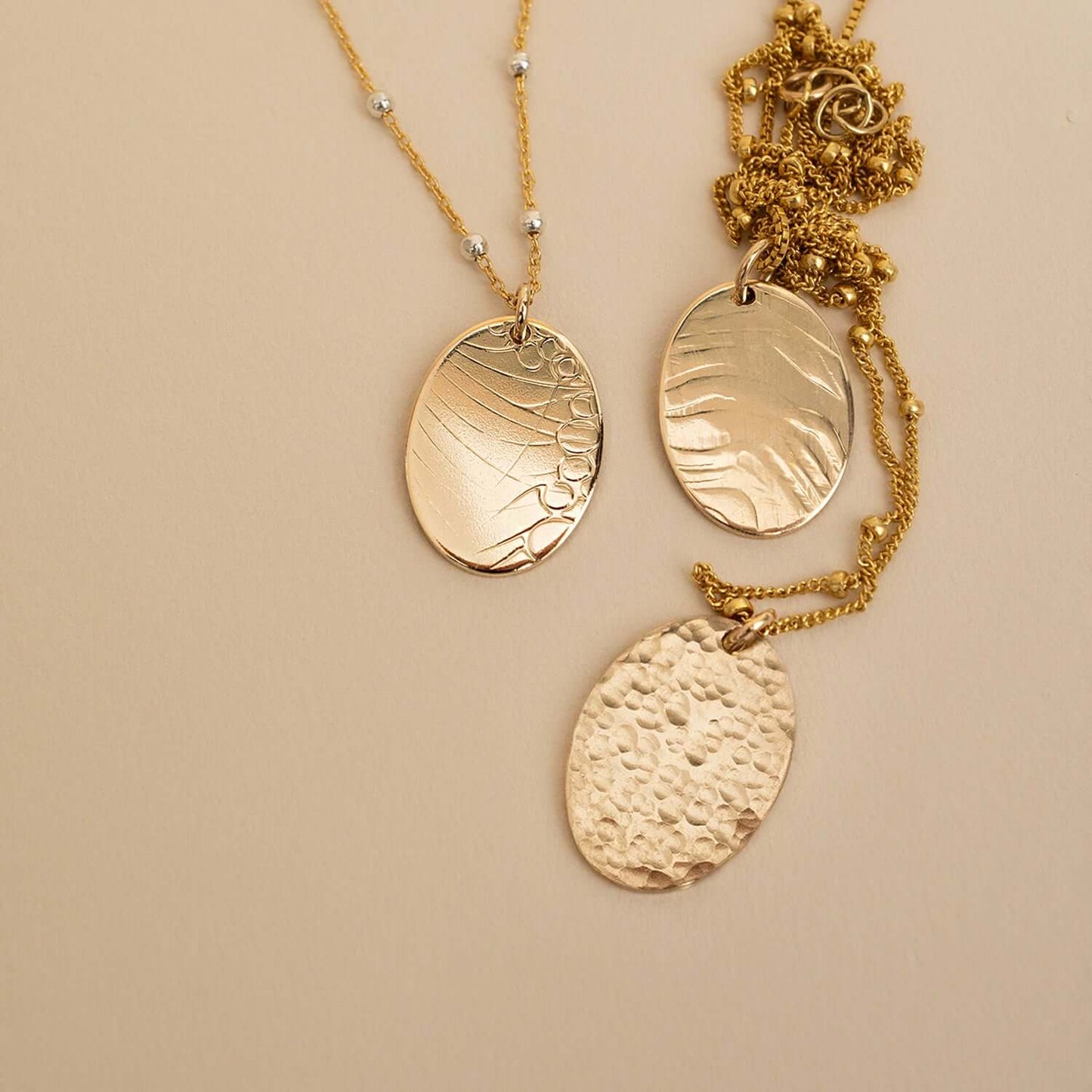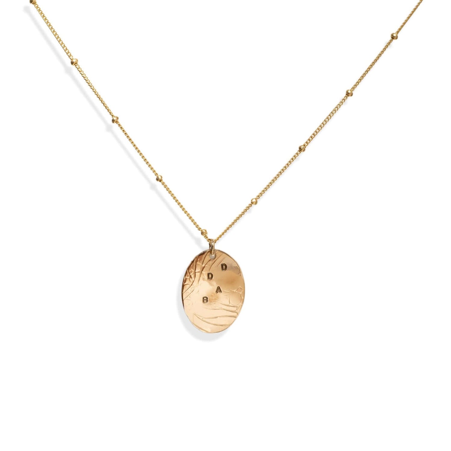 Born from a love for textures, this 14K gold-filled oval pendant necklace takes a classic silhouette and transforms it into a uniquely detailed piece. Initially unexpected in my collection, it quickly became a favorite at live events—so now it’s available worldwide. The 18mm oval pendant comes in three textures: water, with a rippled effect, flora, featuring organic branches and floral silhouettes, and zebra, inspired by bold animal prints. Choose from three chain options, and for a personal touch, add letter stamps to create a custom initials necklace or a family initials pendant.