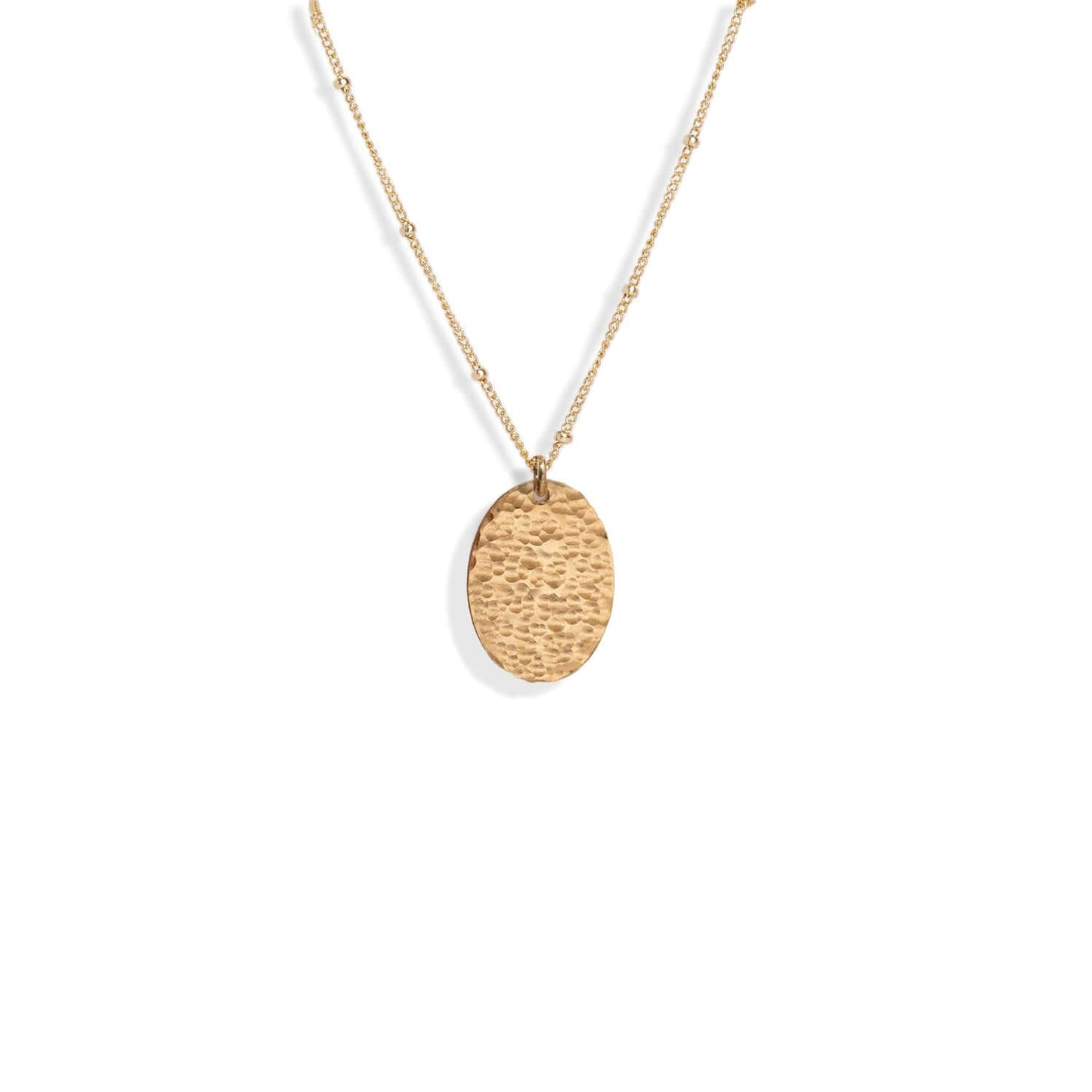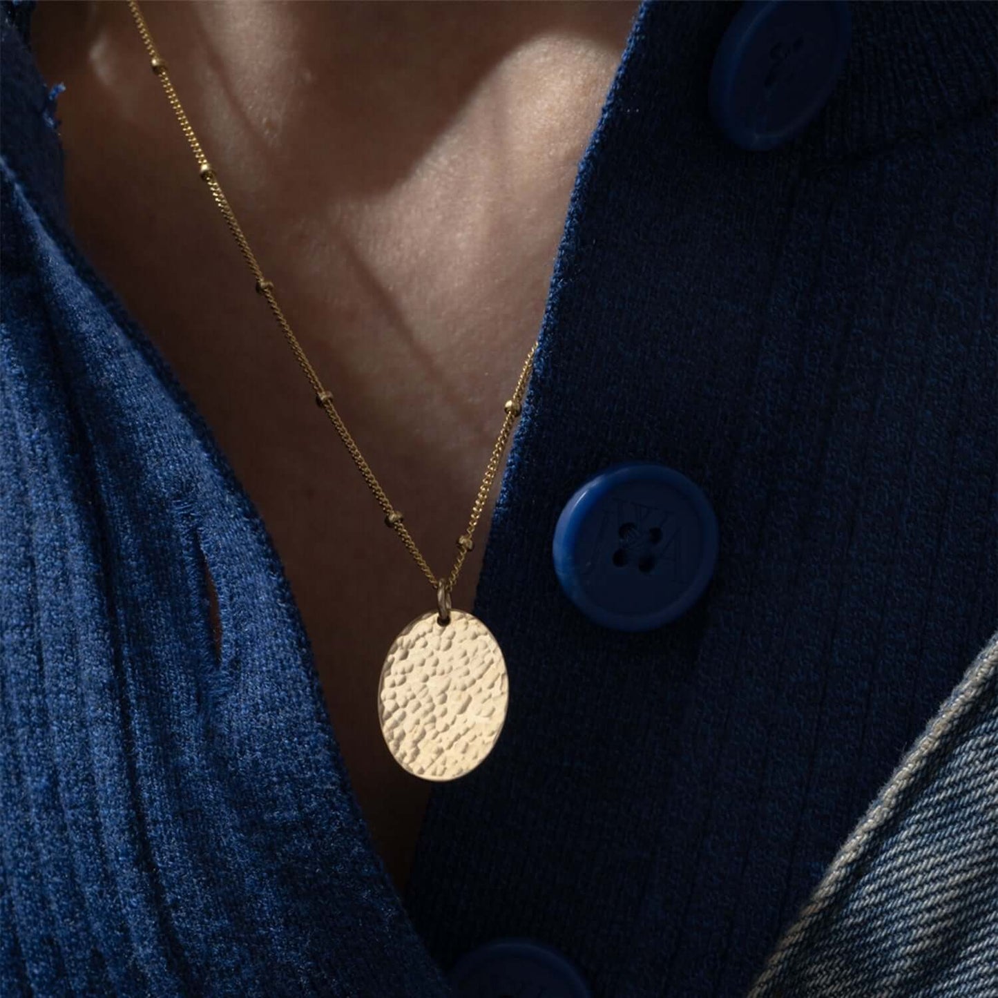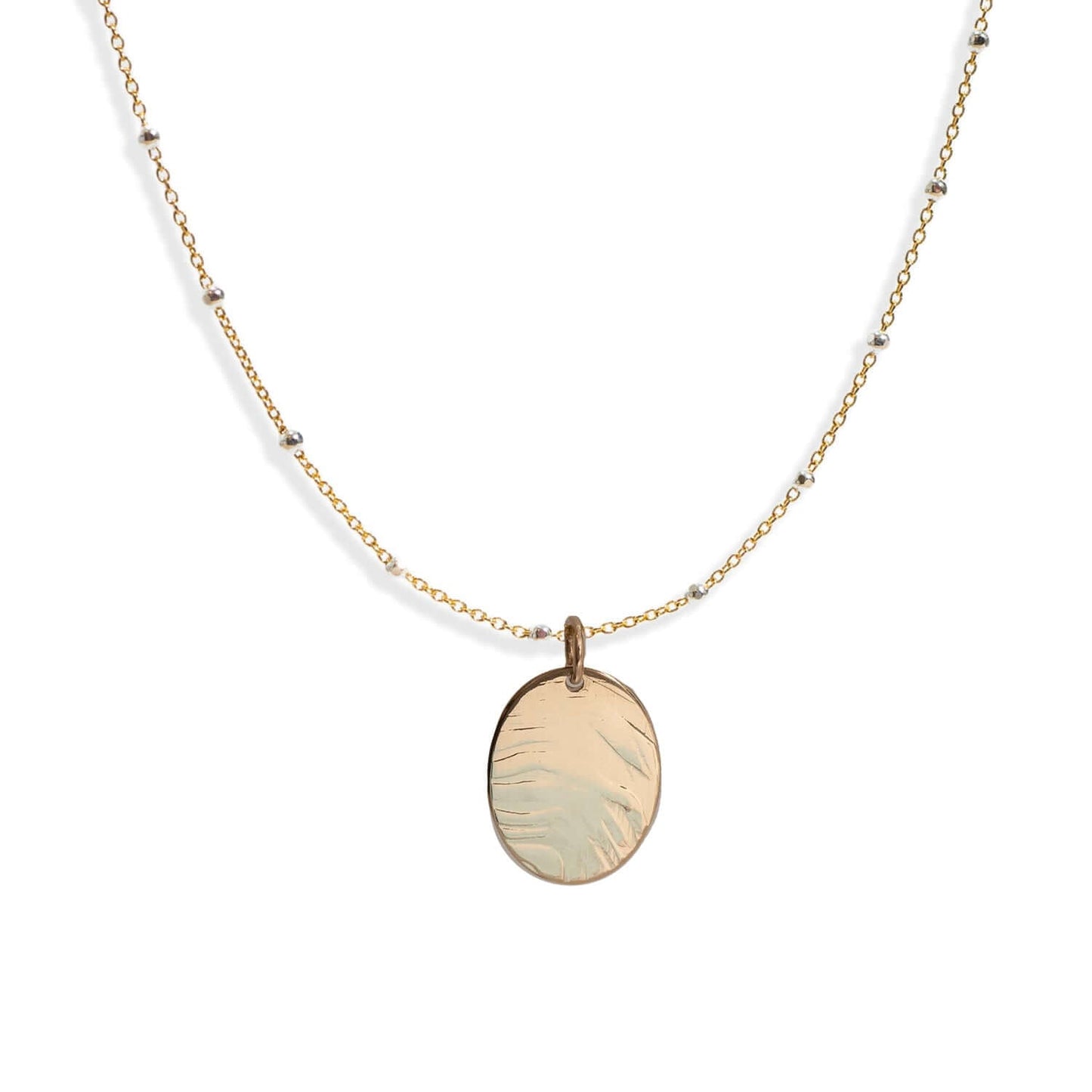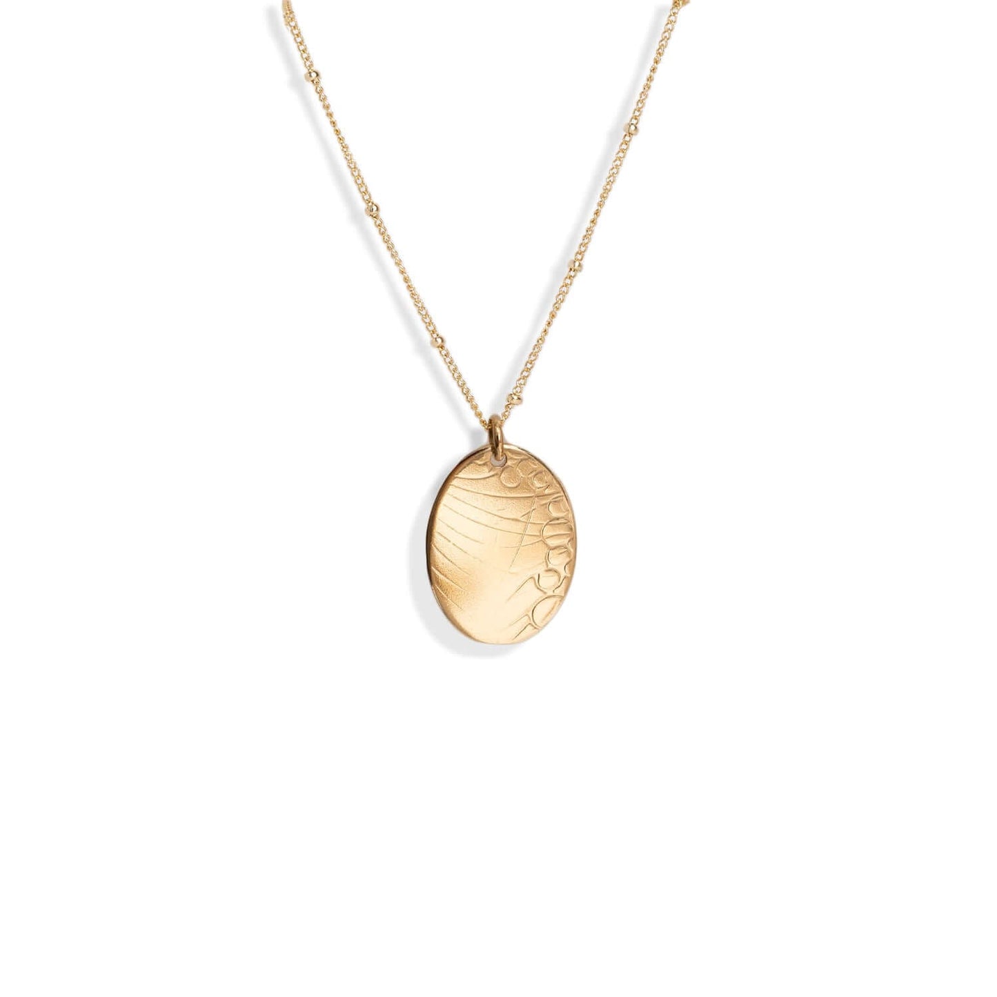 Born from a love for textures, this 14K gold-filled oval pendant necklace takes a classic silhouette and transforms it into a uniquely detailed piece. Initially unexpected in my collection, it quickly became a favorite at live events—so now it’s available worldwide. The 18mm oval pendant comes in three textures: water, with a rippled effect, flora, featuring organic branches and floral silhouettes, and zebra, inspired by bold animal prints. Choose from three chain options, and for a personal touch, add letter stamps to create a custom initials necklace or a family initials pendant.