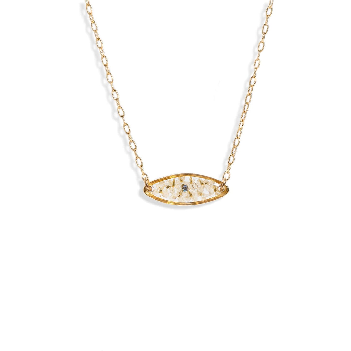 The necklace features a glass-like resin crystal filled with a mixture of real pressed dried flowers and Swarovski crystals, showcased in a transparent oval pendant. Suitable for sensitive skin