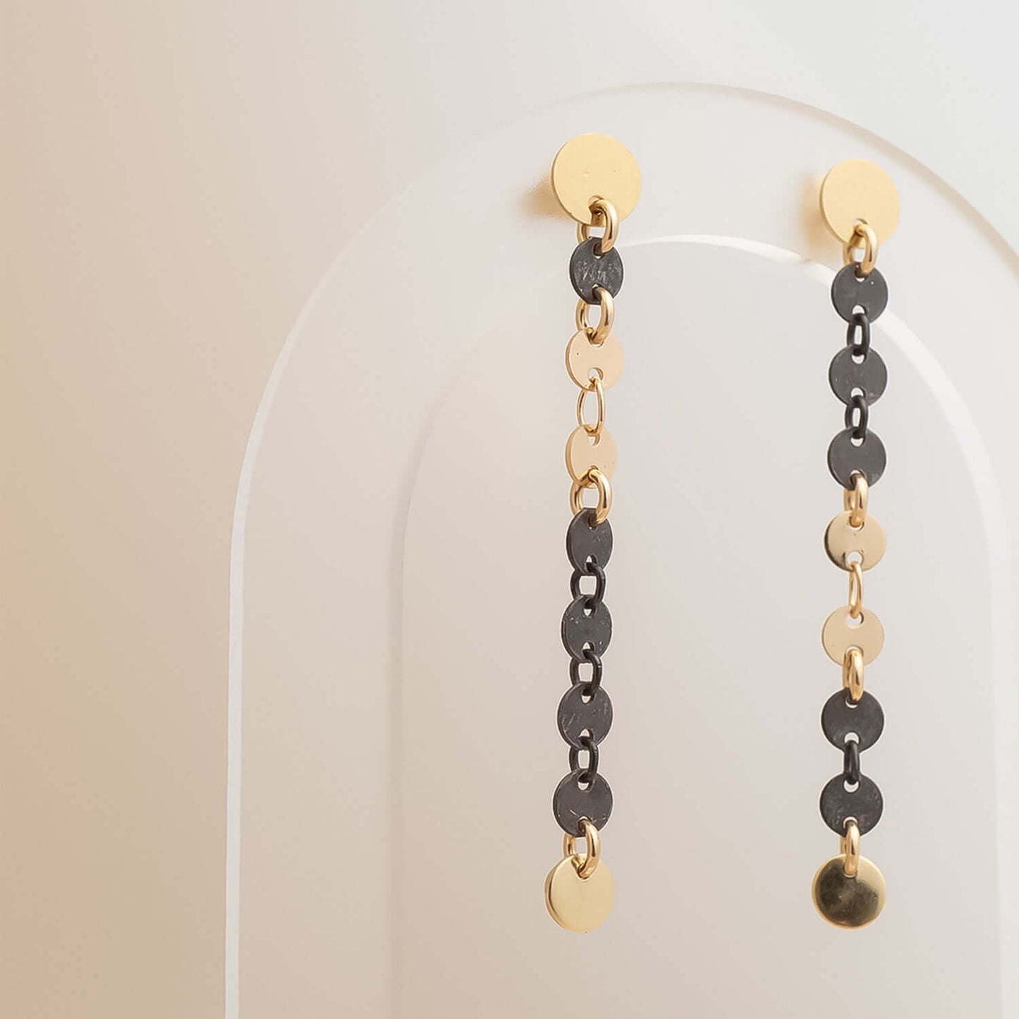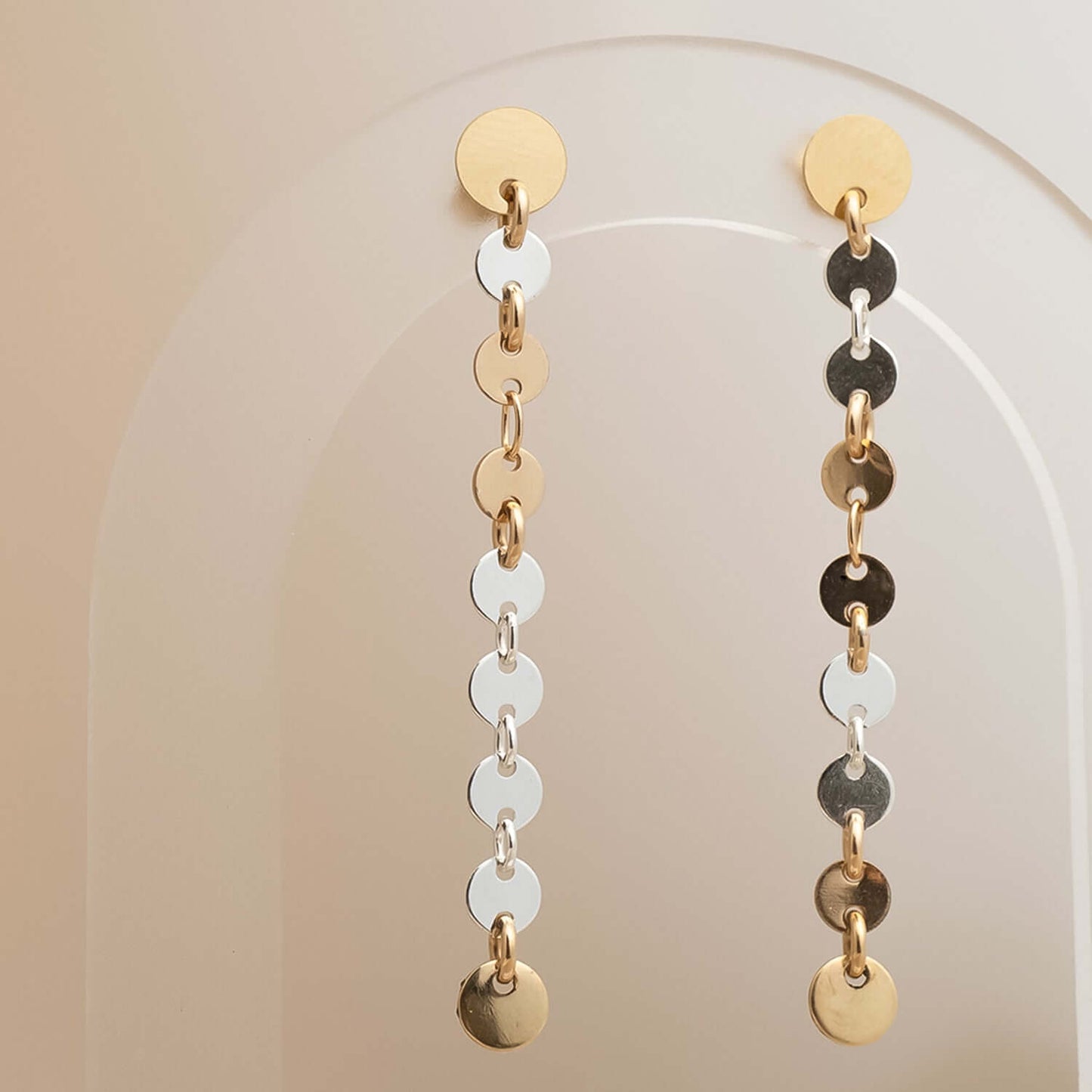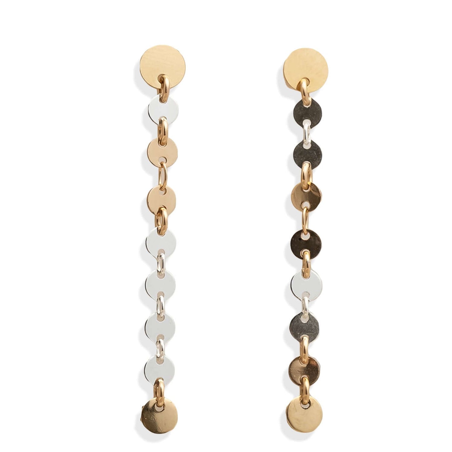 Designed in a lightweight stud-to-dangle silhouette, these sequin chain-inspired earrings measure approximately 2 inches long, allowing them to sway beautifully with every turn of your head. The reflective discs capture light from all angles, creating a soft shimmer effect that’s both playful and refined.