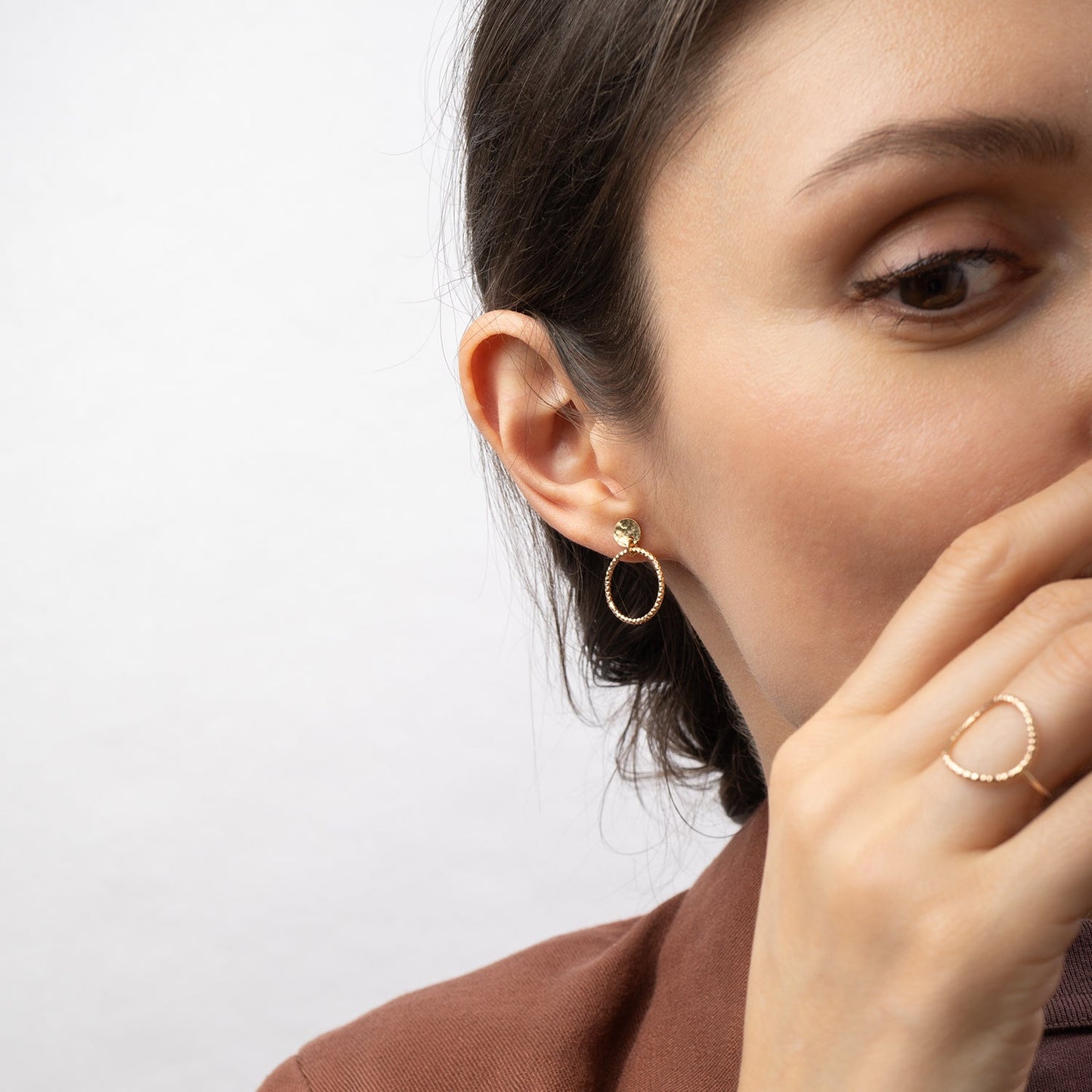 The Disco Hoop Stud Earrings merge the boldness of a statement hoop with the understated ease of a stud post. Measuring 15mm, these handcrafted earrings sit close to the ear with a confident, modern silhouette — all sparkle, no swing.