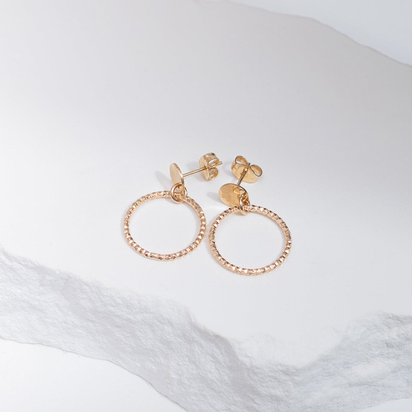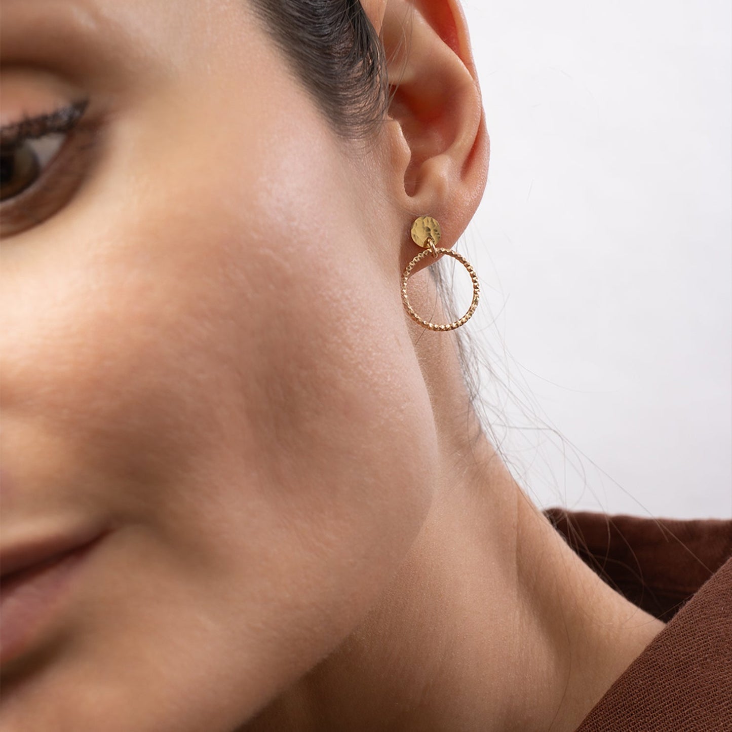 Each hoop is formed from textured gold-filled metal, catching and scattering light from its surface like a wearable prism. The stud-post closure keeps them secure and snug against the earlobe, making them ideal for active days when you still want to shine. No dangling, no snagging — just clean, radiant style.