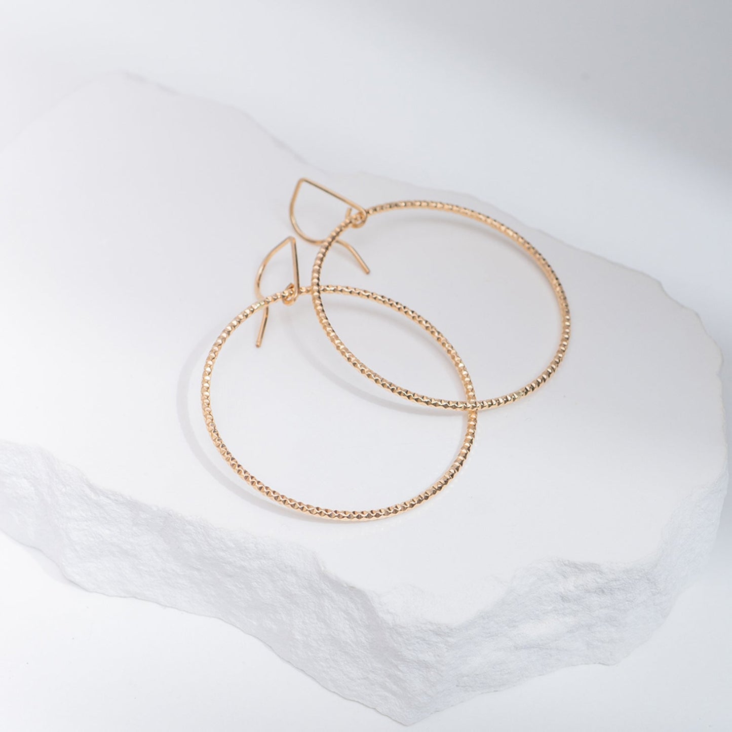 Each hoop measures a dramatic 45mm in diameter, crafted from textured gold-filled metal that gives them a rich, dimensional finish. The surface is intentionally textured to scatter light, producing that unmistakable shimmer — like a mirror ball distilled into jewelry form. Despite their bold presence, they're surprisingly lightweight and comfortable for all-day wear.