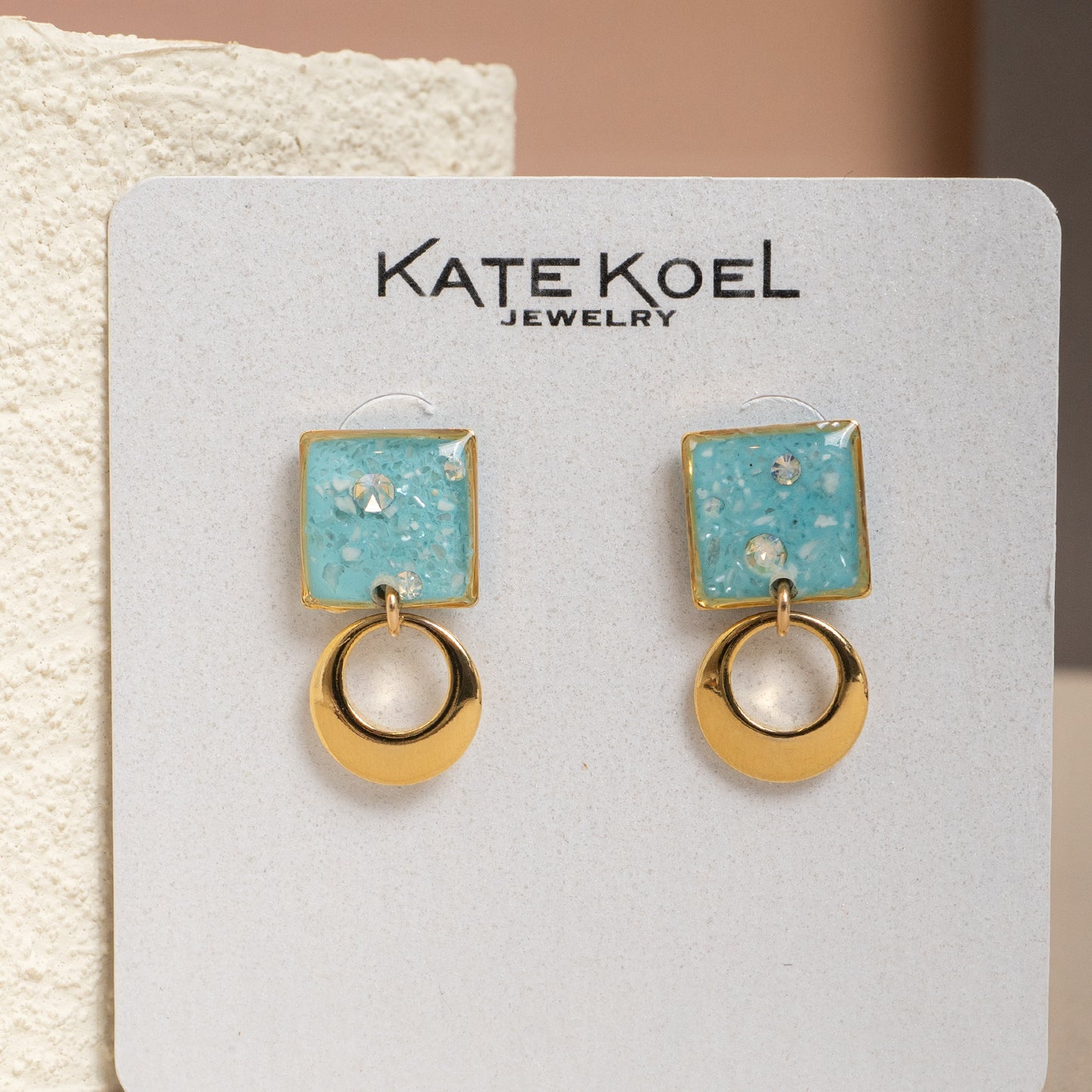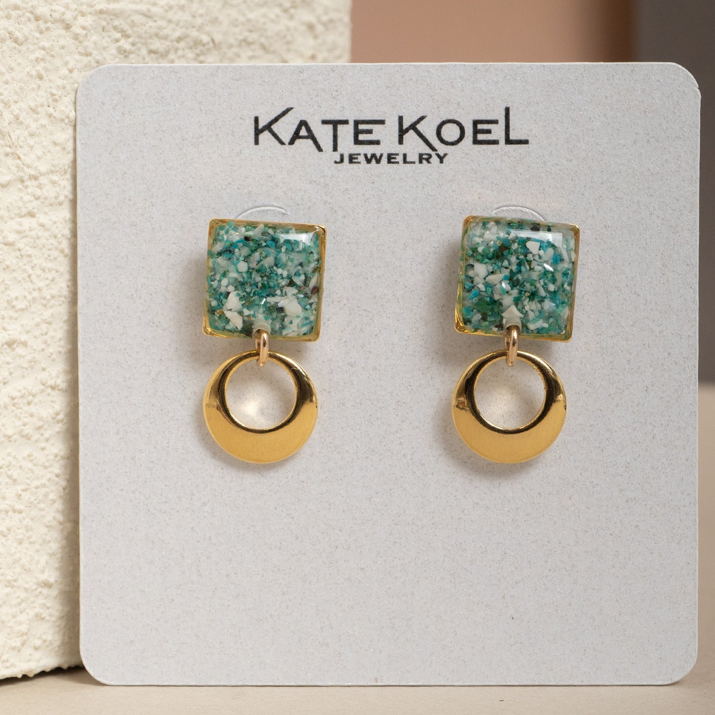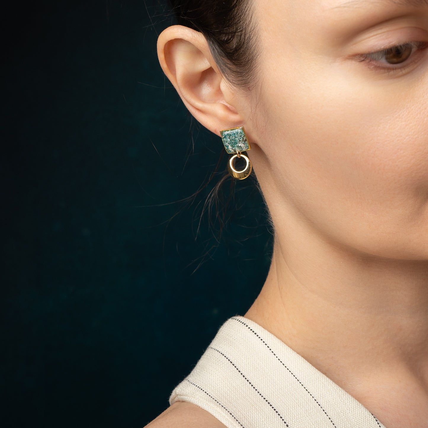 Gemstone Square & Circle Dangle Stud Earrings offer a refined statement with artistic texture and color. Featuring a 15 mm square stud filled with a unique mix of crushed gemstones, each earring is finished with a softly dangling round pendant that adds movement and balance.