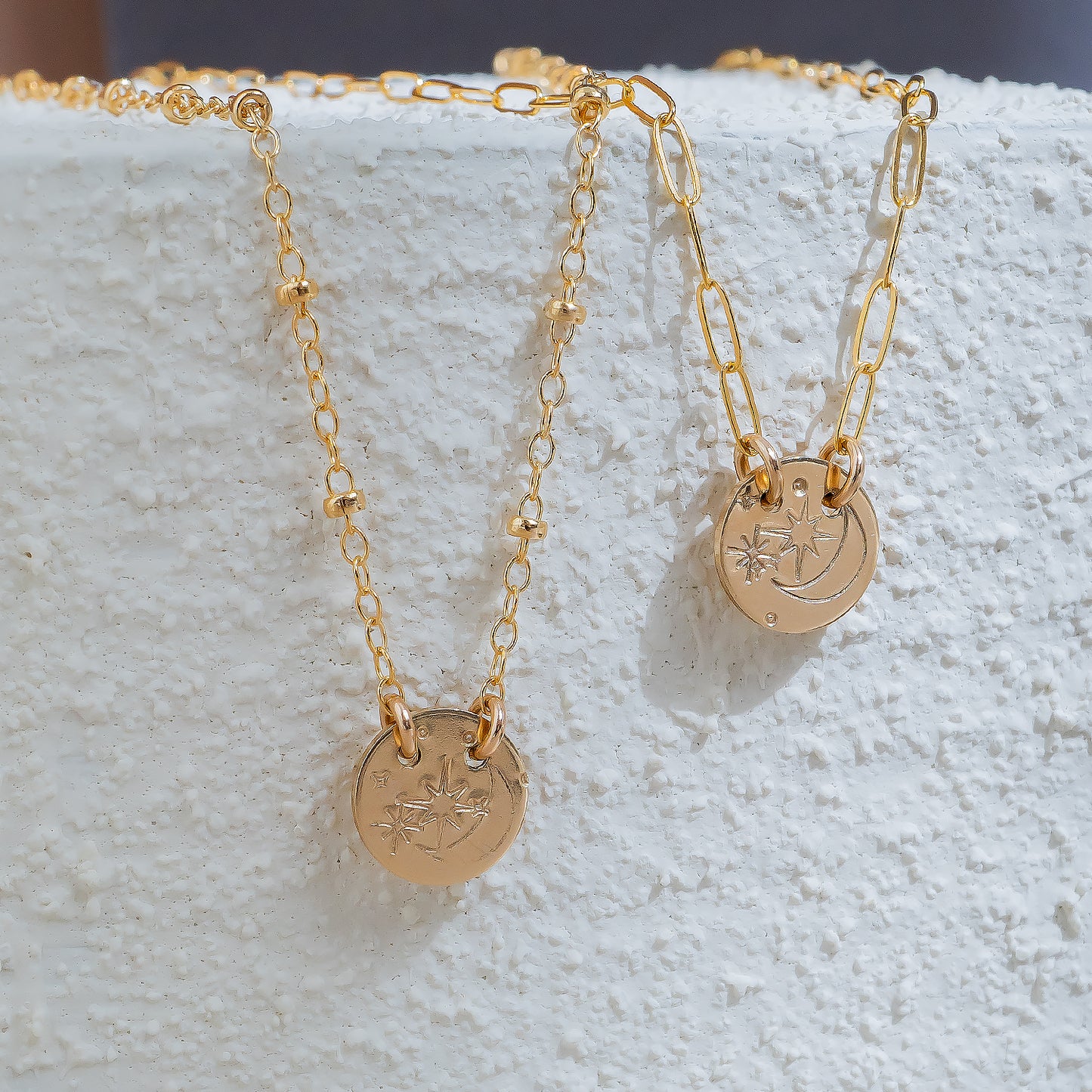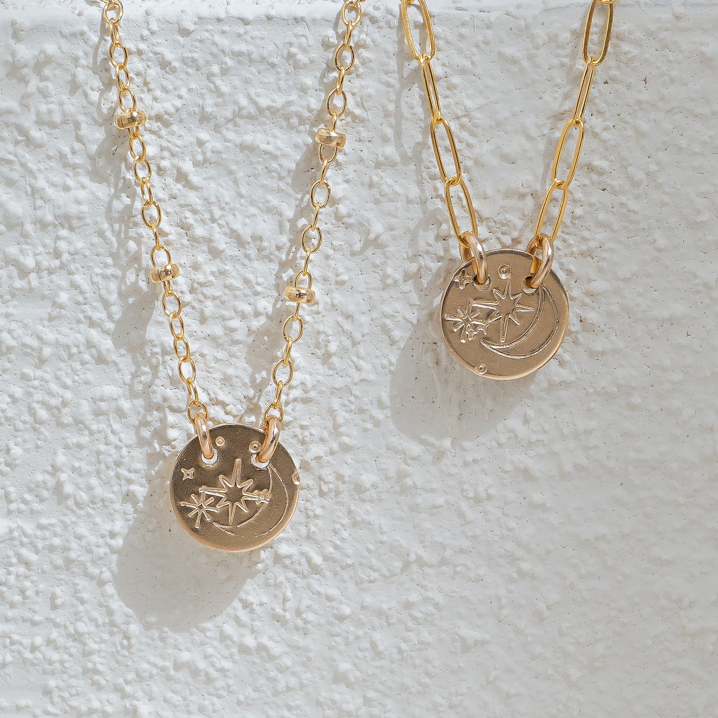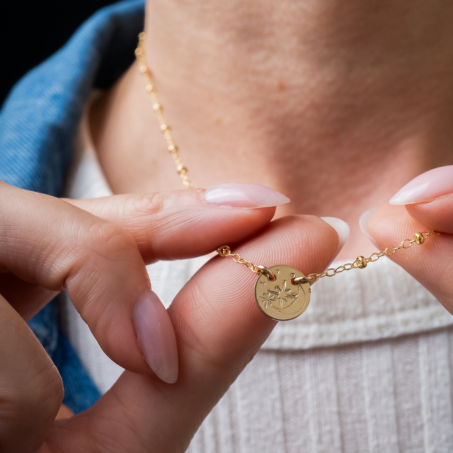 The Night Sky Necklace is a minimalist gold necklace designed for everyday wear. This dainty piece features an 8 mm round disc, hand-stamped with a moon and stars motif, capturing a soft celestial feel. Crafted entirely from 14k gold-filled metal, the necklace is durable, hypoallergenic, and made to last.