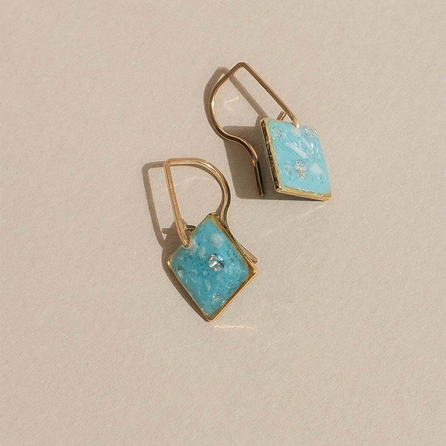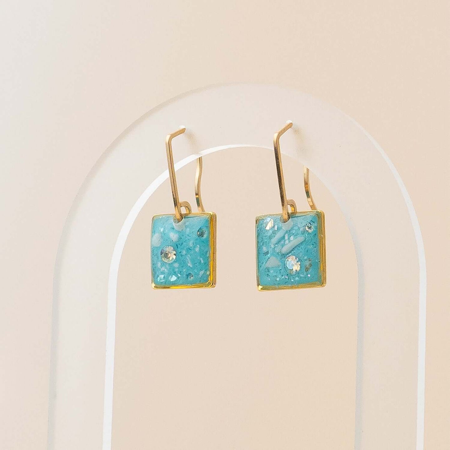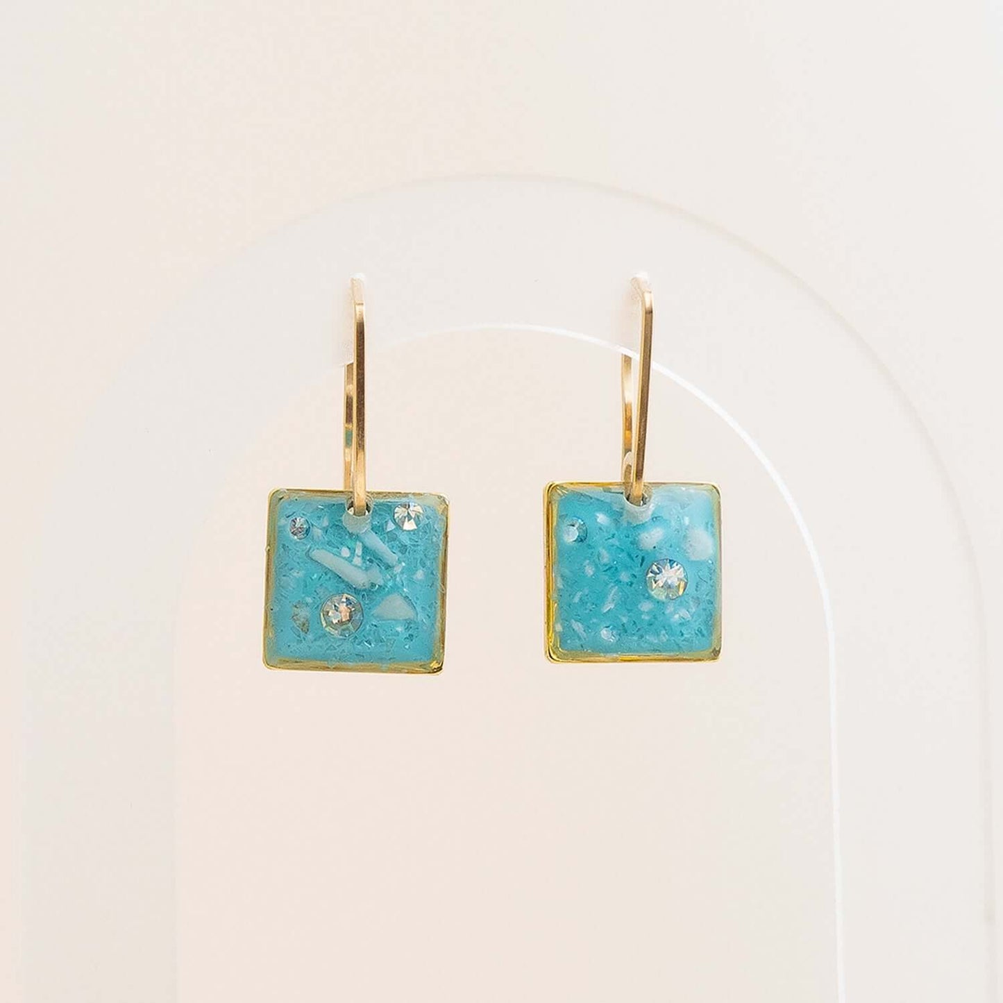 Bring the beauty of the sea to your style with these ocean-inspired square dangle earrings, featuring handcrafted glass-like resin crystals encapsulating crushed turquoise, Larimar, mother-of-pearl, and shimmering Swarovski crystals. Each 15 mm square dangle captures a unique blend of color and sparkle, reminiscent of clear tropical waters under the sun.