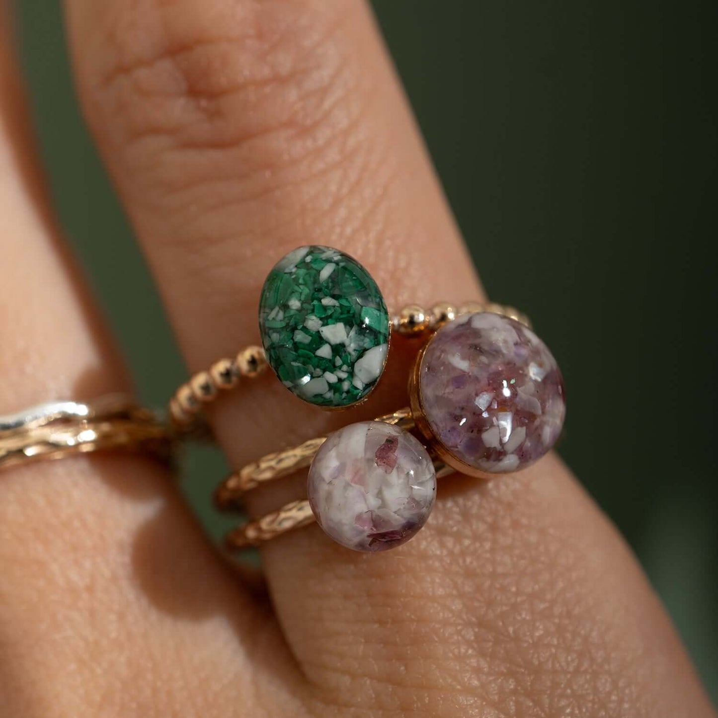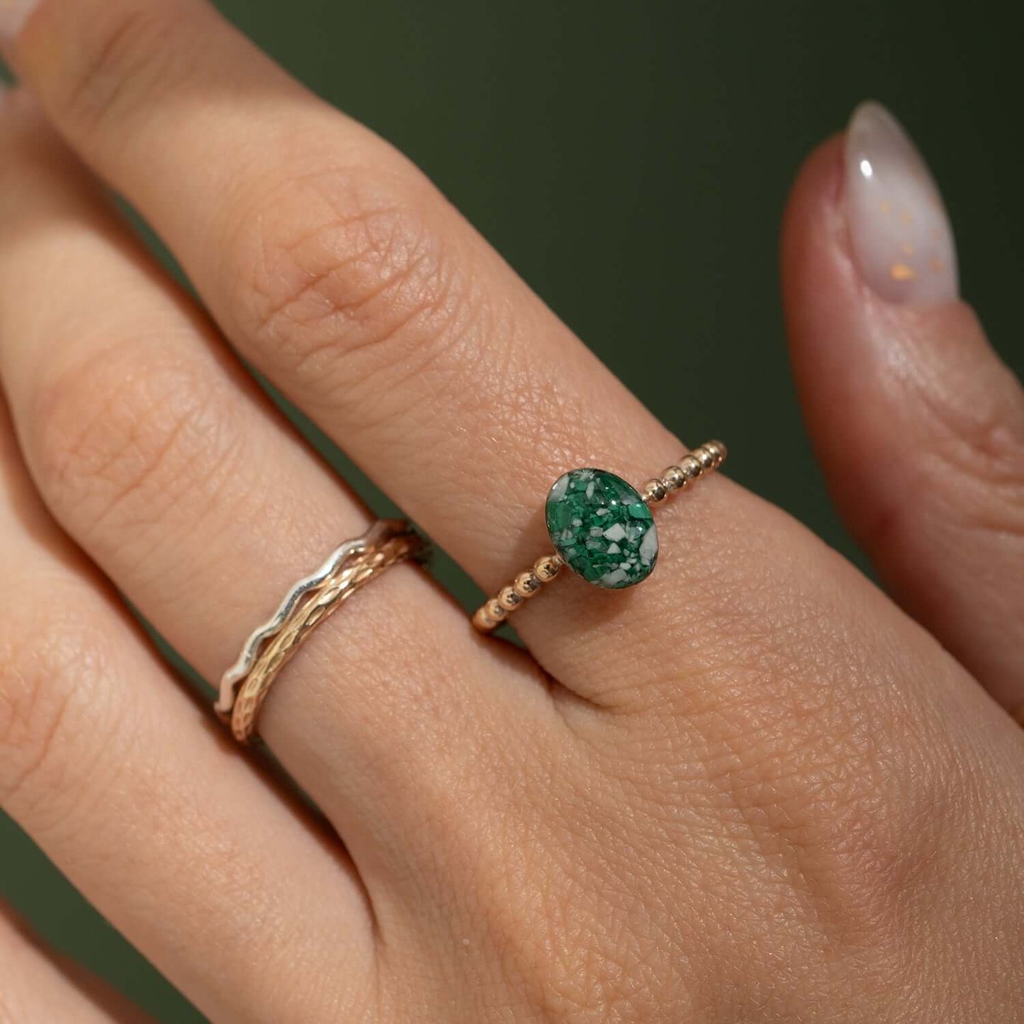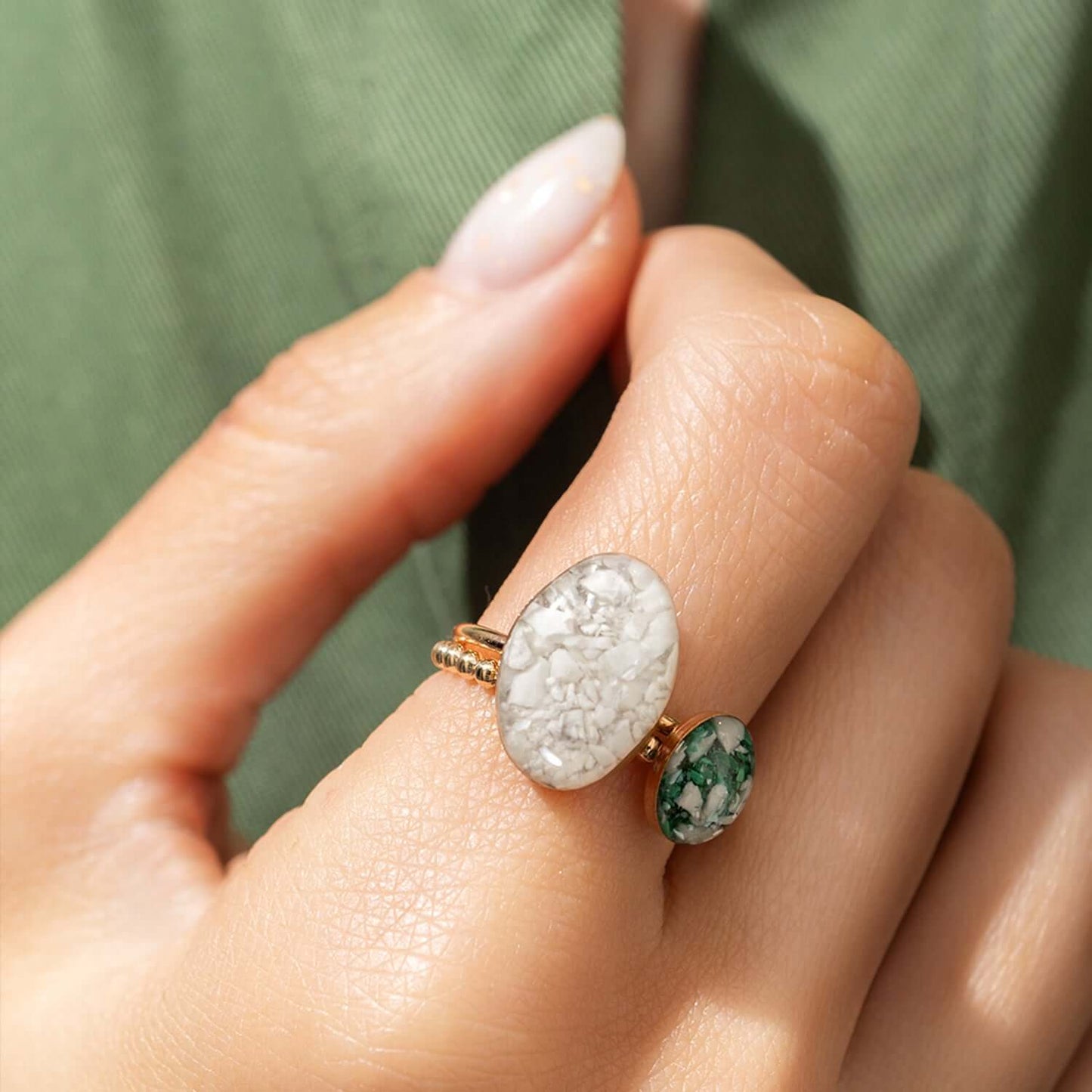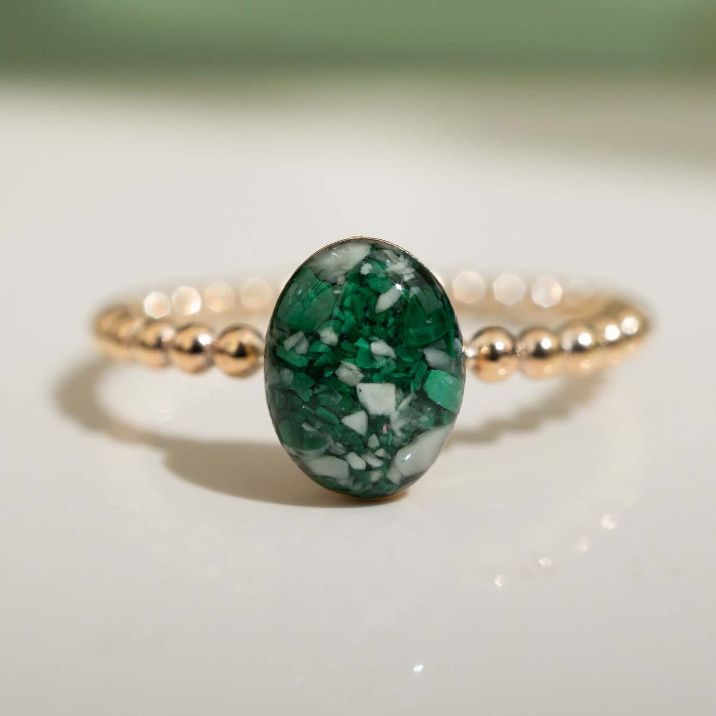 A specially crafted oval crystal sits on a sparkly bubble band, featuring a unique blend of crushed malachite, howlite, and shimmering mother-of-pearl, all encased in a glass-like resin crystal. This piece captures the essence of nature with its striking color contrasts and organic textures.