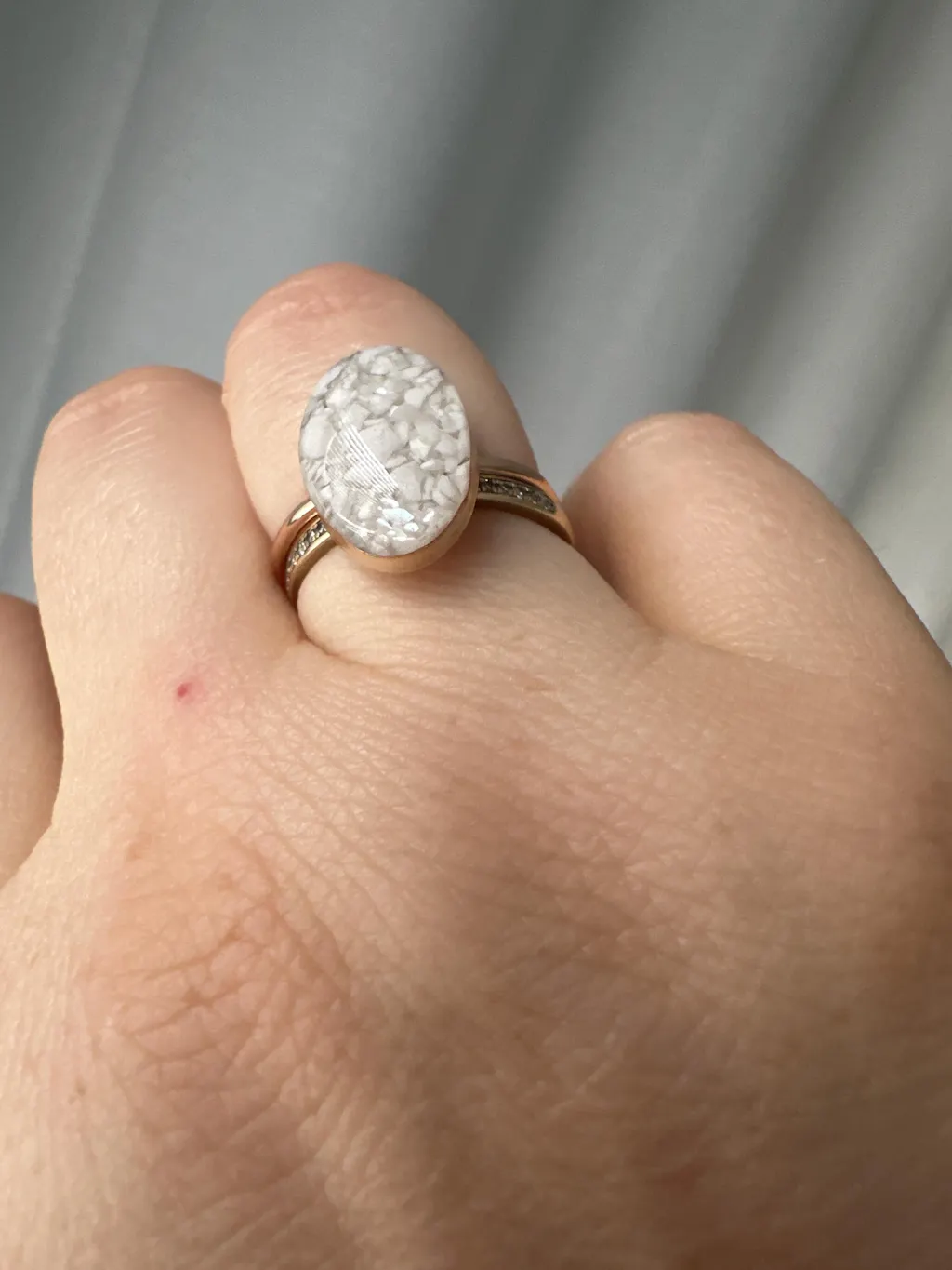 Delicate Howlite rings with tiny Howlite and Pyrite stone pieces captured in glass like resin in three crystal sizes. Bright ring is a perfect compliment to your everyday style. Beautiful by itself or in a stack. Every piece is hand made in our studio and always unique.