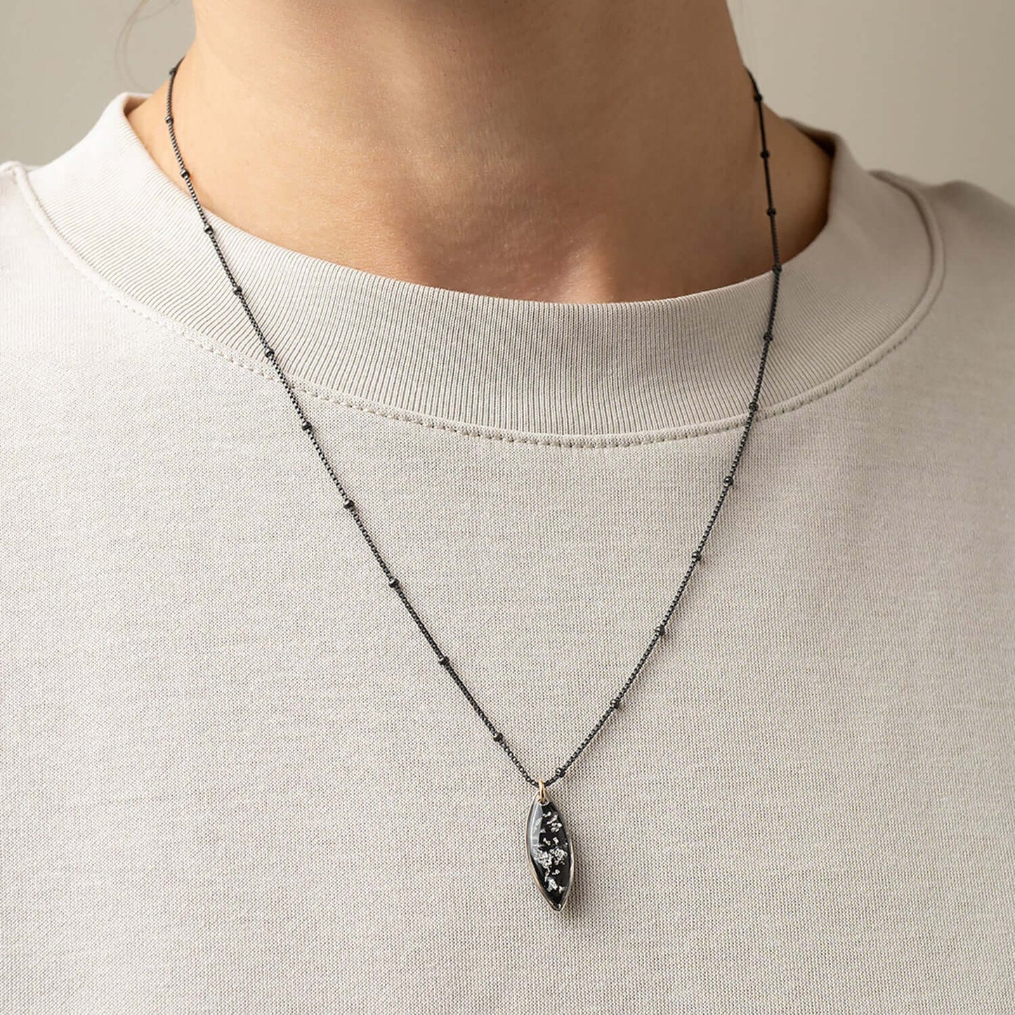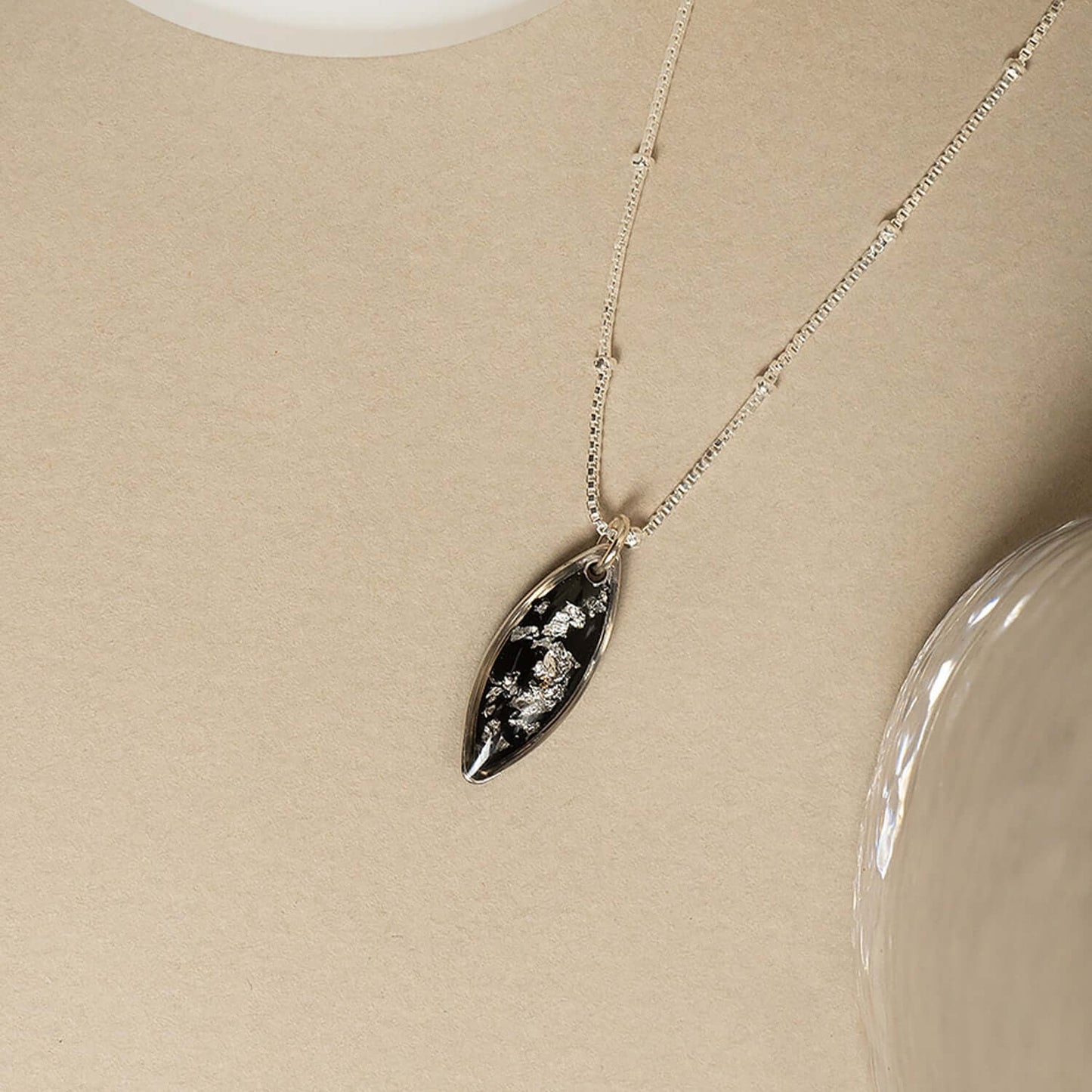 Oval Necklace feature glass-like hand made crystal with silver leaf, on a black pigmented background. Every piece is hand made in our studio.