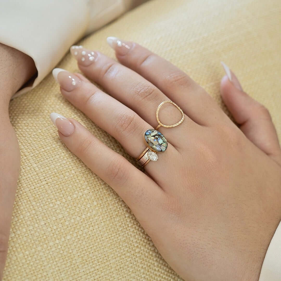 The Statement Abalone Shell Oval Ring brings the ocean's most captivating color palette to your hand. Featuring a generous oval face of genuine abalone shell, this handcrafted ring shimmers with blues, greens, purples, and pinks that shift with every movement — like holding a piece of the tide on your finger.